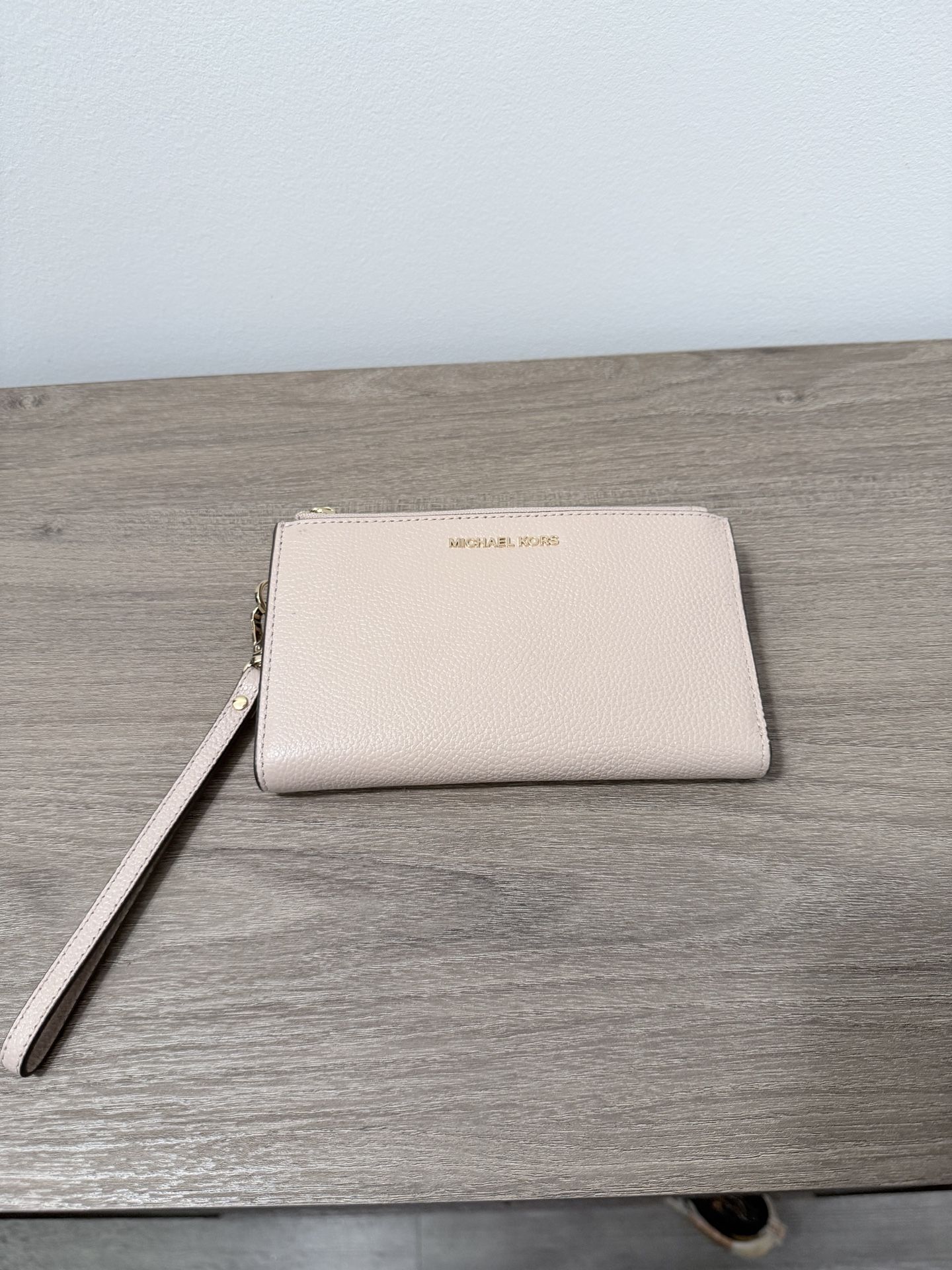 Keep your essentials organized with this authentic Michael Kors Adele Double-Zip Smartphone Wristlet. Crafted from premium pebbled leather in a soft pink/beige hue, this versatile accessory functions as both a spacious wallet and a chic wristlet. This item is in New Without Tags (NWOT) condition. It has never been used and still includes the original internal protective foam and Michael Kors brand card. Product Details • Brand: Michael Kors • Model: Adele Double-Zip Smartphone Wristlet • Material: Pebble Leather with Gold-Tone Hardware • Color: Soft Pink / Beige (similar to "Powder Blush" or "Fawn") • Dimensions: Approximately 7-1/4"W x 4-1/2"H x 3/4"D Interior Features • Two Zip Compartments: Perfect for secure storage of cash or receipts. • Phone Pocket: Dedicated center snap compartment designed to fit most smartphones. • Organization: Includes 6 credit card slots, 1 ID window, and 2 slip pockets. • Strap: 6-inch removable leather wristlet strap. Condition Note • Excellent, pristine condition. • No signs of wear, scuffs, or interior marks. • Smoke-free and pet-free storage.