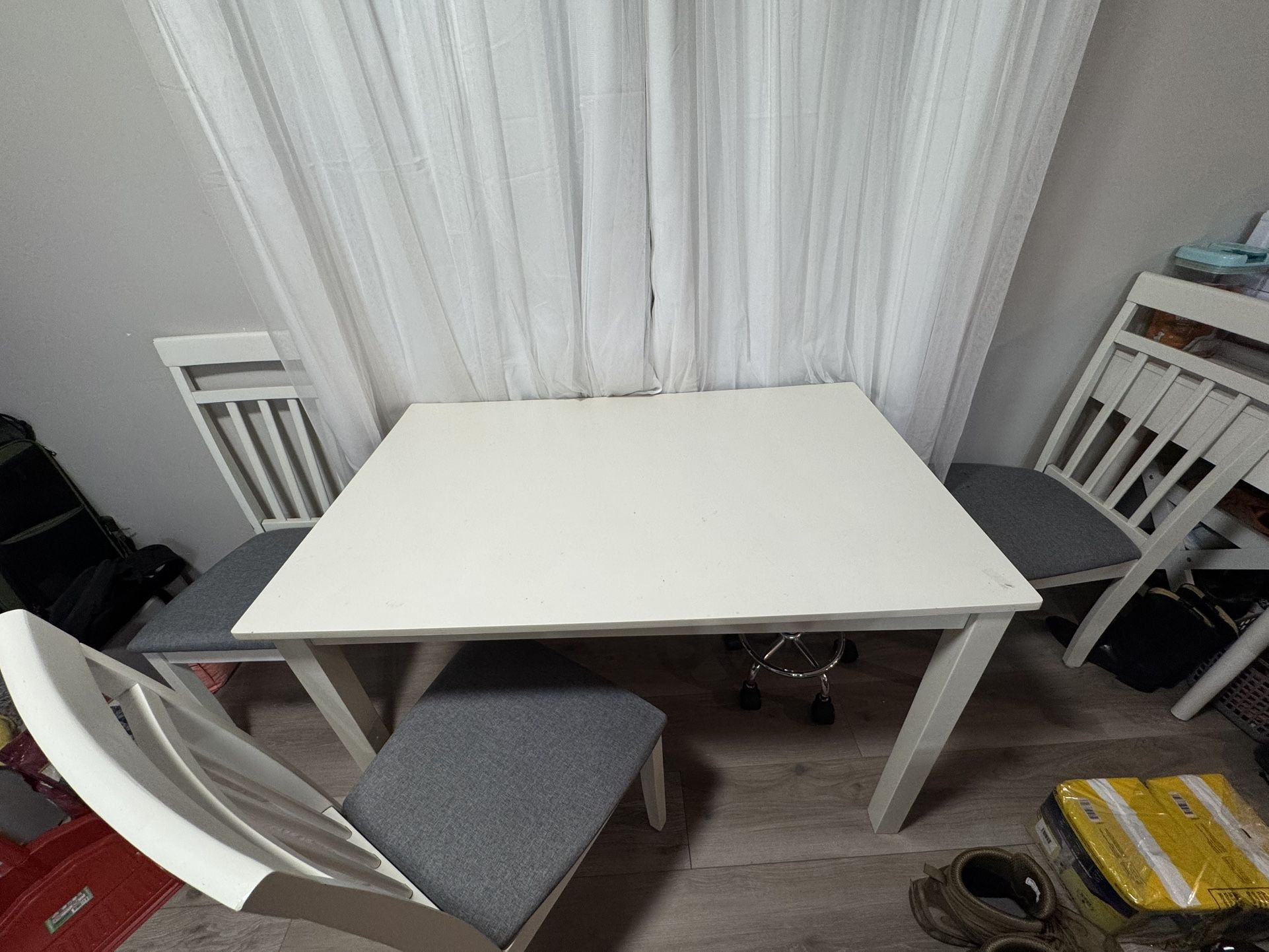 Dinner table Craft table 43 1/4” long 27 1/2” deep 29” tall Comes with 4 matching chairs. Typical nics and chips. Could use a new coat of paint. Send me your offer, i need to get rid of this quick.