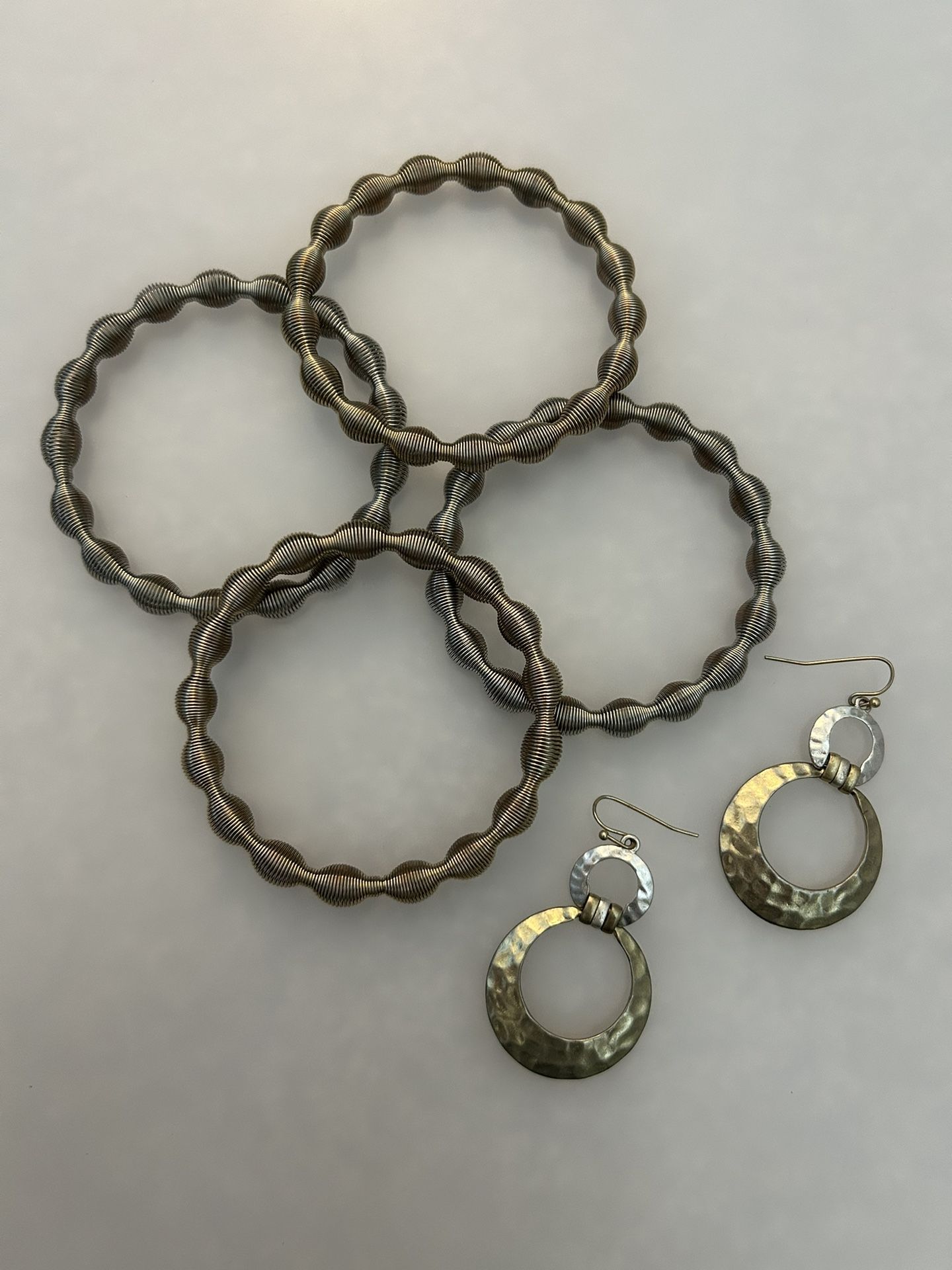 2 Silver and 2 Gold/Bronze Stretch Bangles with hammered Silver and Gold/Bronze Earrings.
