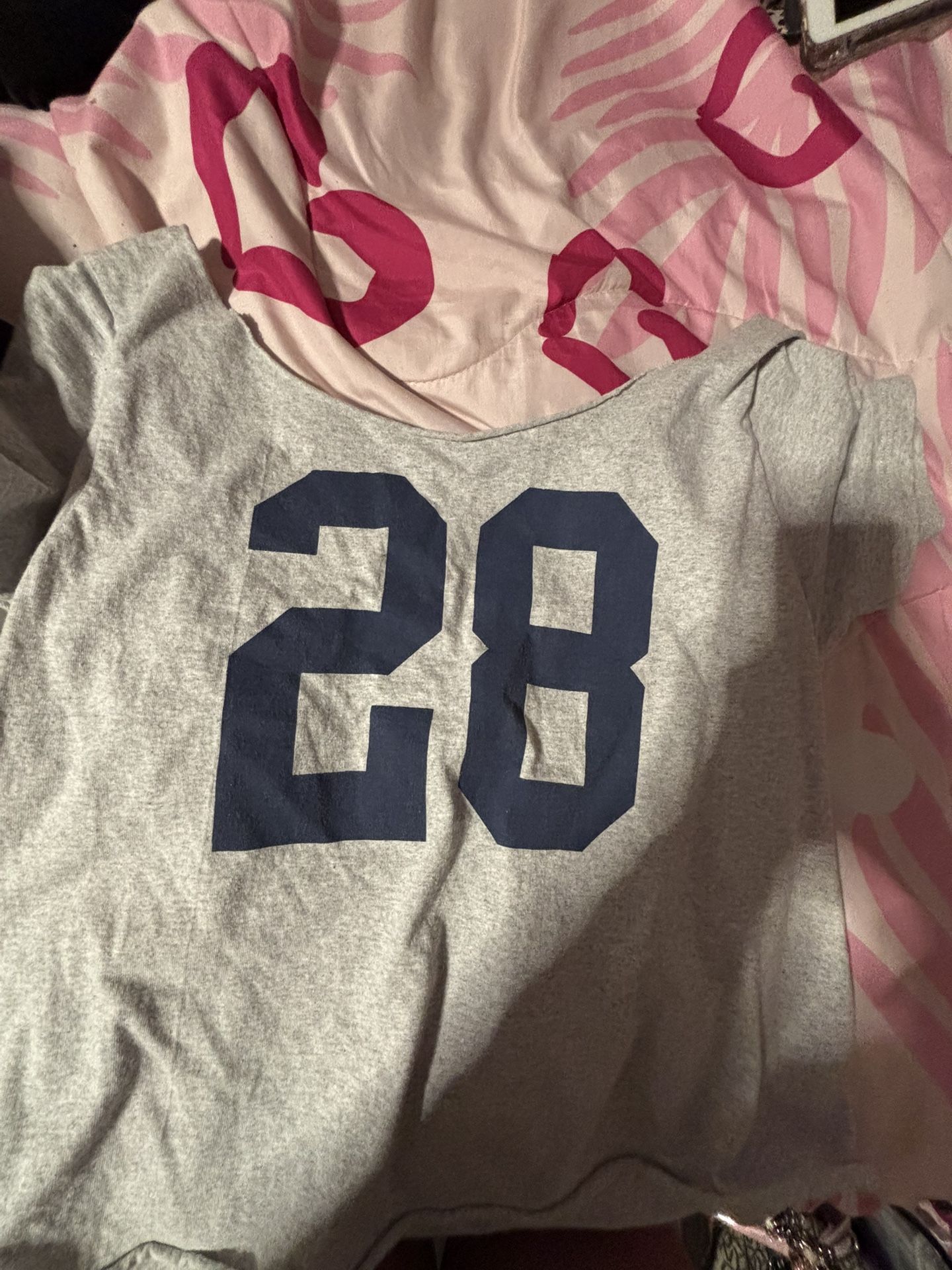 Brandy Melville John Galt Robyn 28 off-the-shoulder top in a gray/cream color with navy numbers