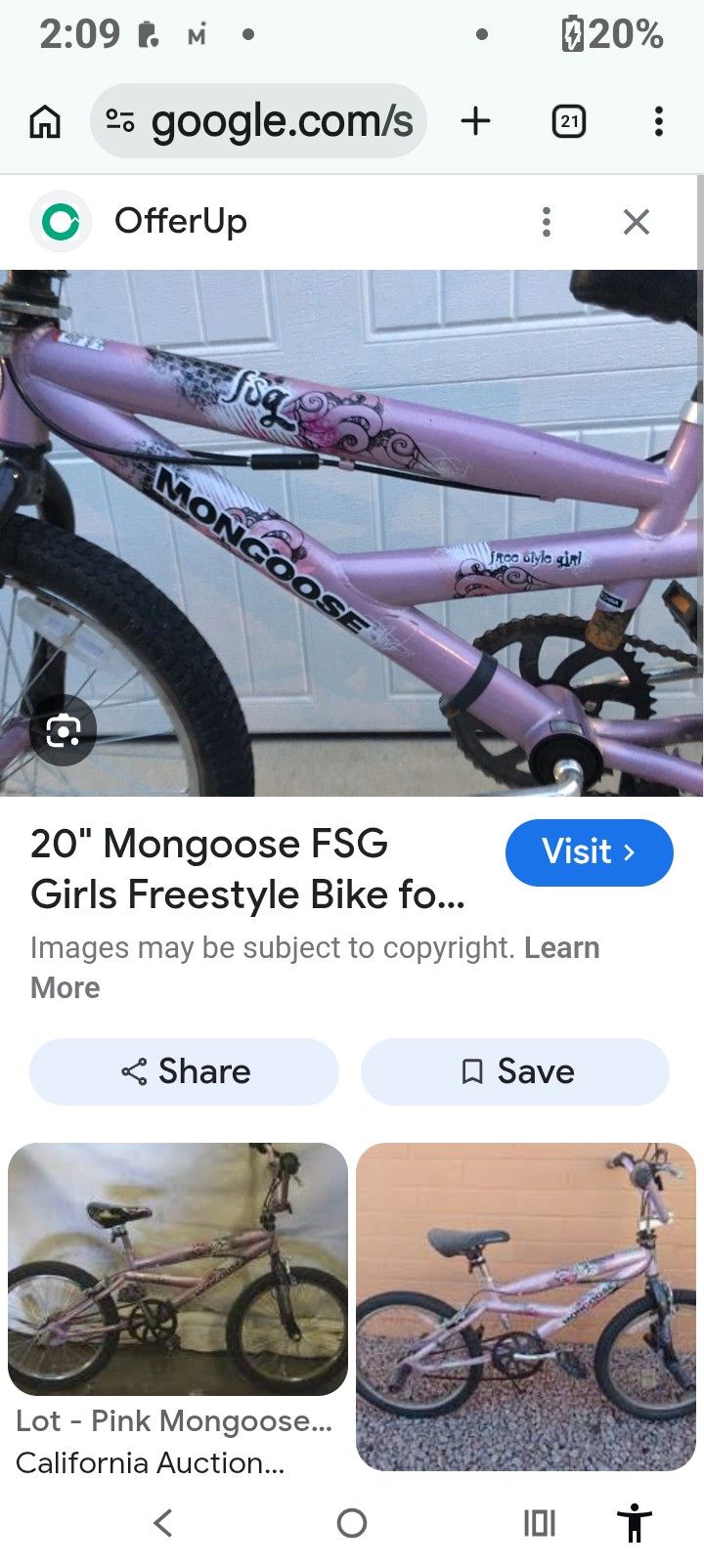 Mongoose FSG Freestyle Girls BMX Bike 20" — Pink Purple Description: Up for sale is this super cool Mongoose FSG Freestyle Girls BMX bike in pink and purple. Great bike for any girl who loves to ride! The Mongoose FSG was designed specifically for girls who want to ride freestyle and look good doing it. ✅ Brand: Mongoose FSG ✅ Wheel Size: 20 inch ✅ Color: Pink/Purple ✅ Style: Freestyle BMX ✅ Great for ages 8-14 ✅ Mongoose is a trusted BMX brand Perfect starter bike or upgrade for a young rider! Located in Ford, Washington. Local pickup only. Asking $65 — firm!