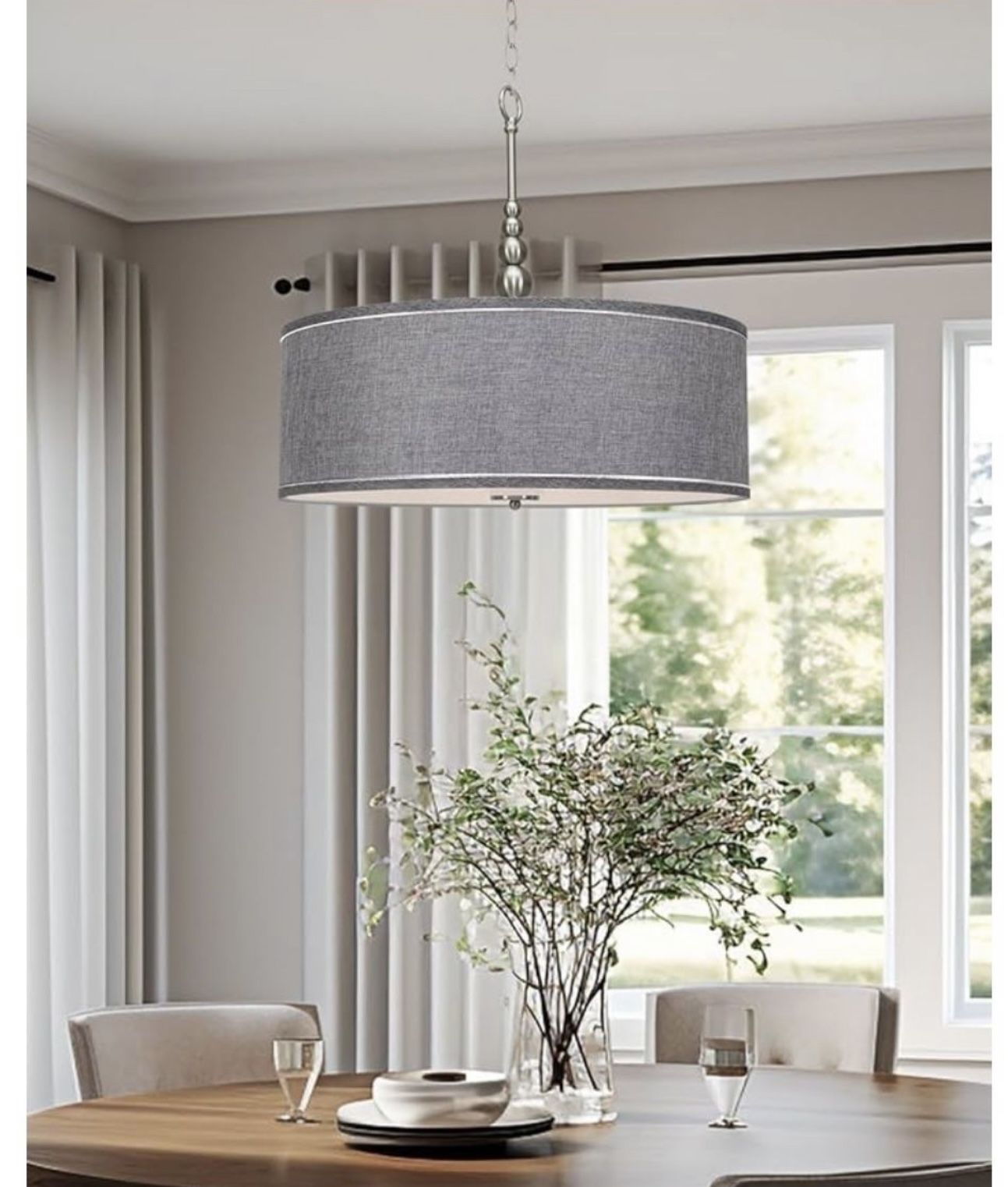 Brand Kira Home Color Brushed Nickel Material Metal Shape Drum Special Feature Dimmable, Sloped Ceiling Compatible Finish Type Brushed [MODERN DESIGN] This 3-light drum pendant light radiates elegance, showcasing a chic brushed nickel finish and high-quality, hardback fabric gray shade. The hanging light includes five beautifully crafted orb / ball accents and premium glass diffuser, casting a warm glow over its installed space, making it a prime choice amongst designers and builders
