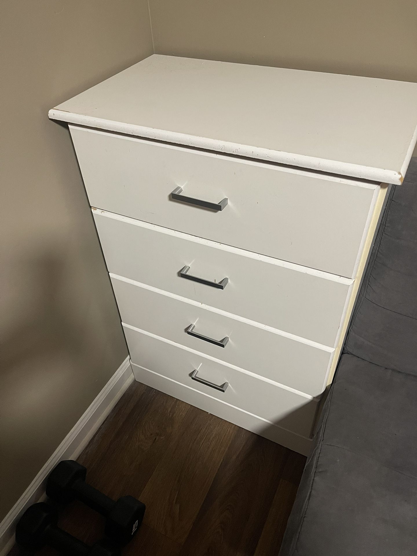 Matching white dressers. 3ft tall and 2ft wide. Drawers are 7 inches deep; 21 inches wide.
