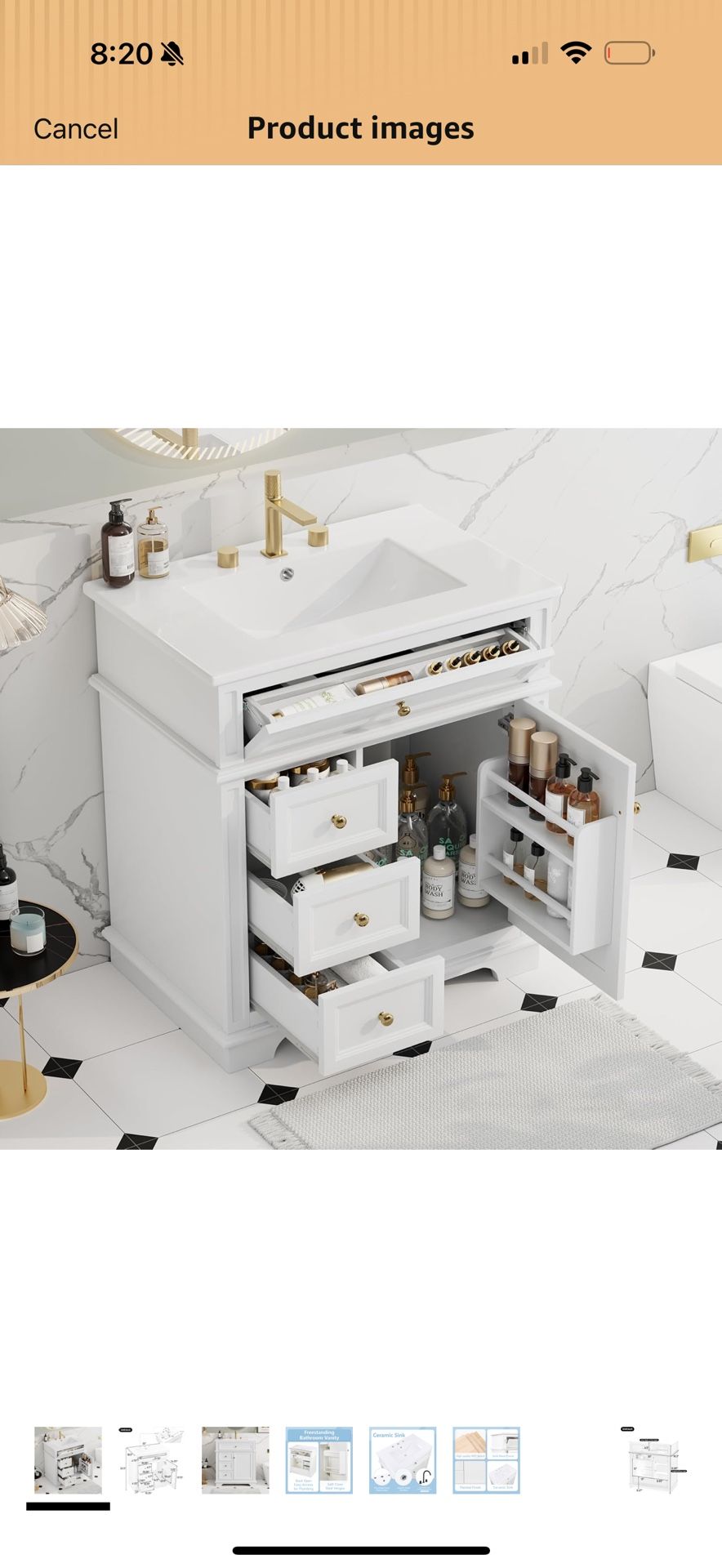 White 30in vanity, brand new in box has to be assembled( the drawer need to be put together), has lots of storage, truly a stunning vanity. Selling because cabinet is on the right and my pluming is on the left