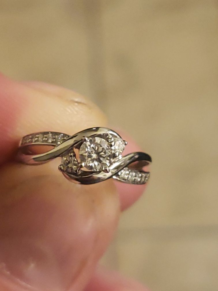 Will post real pictures later today. Item is previously owned. Was just serviced at Kay's they checked the diamonds and cleaned the ring. Can meet at a Kay's location so you can see them service and clean the ring again so you are sure that the gold and diamonds are real. Been sitting in the original box it came in and hasn't been worn in a while. Item number is # 991538101 retail at Kay's is $1,549.00 paid 1,249.00 for ring. Three stunning round diamonds are embraced by sweeps of 14 K white gold in this splendid engagement ring for her. Ribbons of additional round diamonds and 14 K white gold flow along the band to complete the look. The ring has a total diamond weight of 3/8 carat. Diamond Total Carat Weight may range from .37 - .44 carats DIAMOND Primary Diamond Weight 1/3 CT. Primary Diamond Cut ROUND Primary Diamond Color WHITE(I) Primary Diamond Clarity I2 Primary Diamond Setting PRONG SETTING DIAMOND1 Diamond Sidestone Shape Diamond1 ROUND Diamond Sidestone Color Diamond1 WHITE(I) Diamond Sidestone Clarity Diamond1 I2 Diamond Sidestone Setting Diamond1 PRONG SETTING Diamond Sidestone Count Diamond1 12 DIAMOND2 Diamond Sidestone Carat Weight Diamond2 1/20 CT. Diamond Sidestone Shape Diamond2 ROUND Diamond Sidestone Color Diamond2 WHITE(I) Diamond Sidestone Clarity Diamond2 I2 Diamond Sidestone Setting Diamond2 PRONG SETTING Diamond Sidestone Count Diamond2 2 Metals 14 KARAT WHITE GOLD