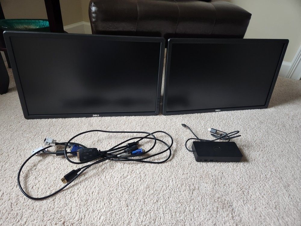 Two dell 24 inch monitors. Selling with display cables and converters along with docking station (dell). Works perfectly.