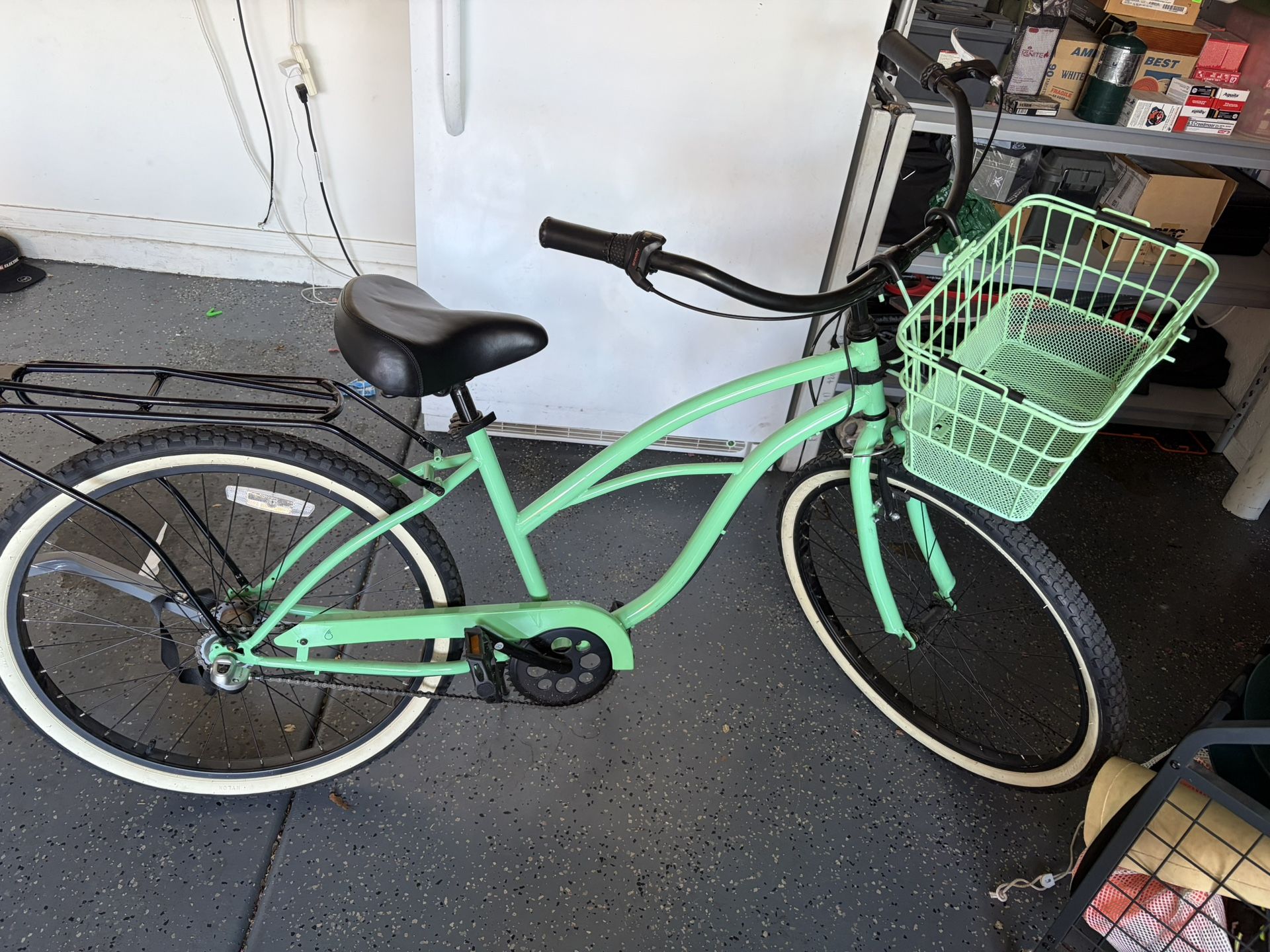 Well used but still rides great. Tires are flat just needs new tubes. Comes with a matching front basket. Tires 57=559 (26×2.125)
