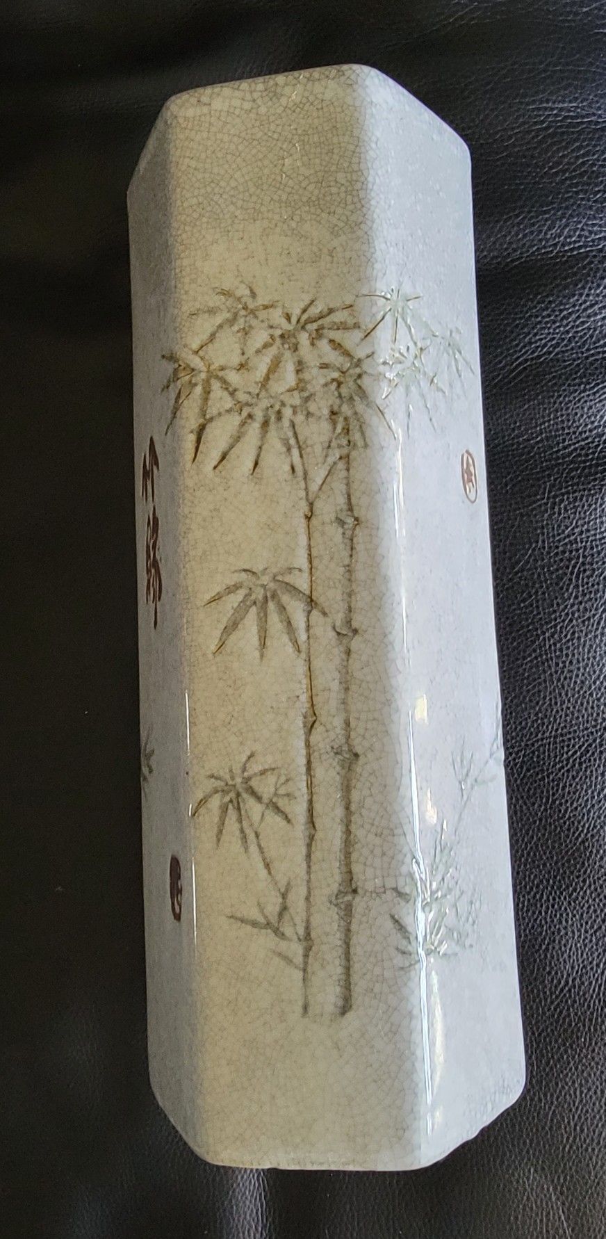 Ceramic flower vase with letter and bamboo decoration. Hight 12-1/4" width 4-3/8" lenght 4-3/4". Diameter top 3-1/4"