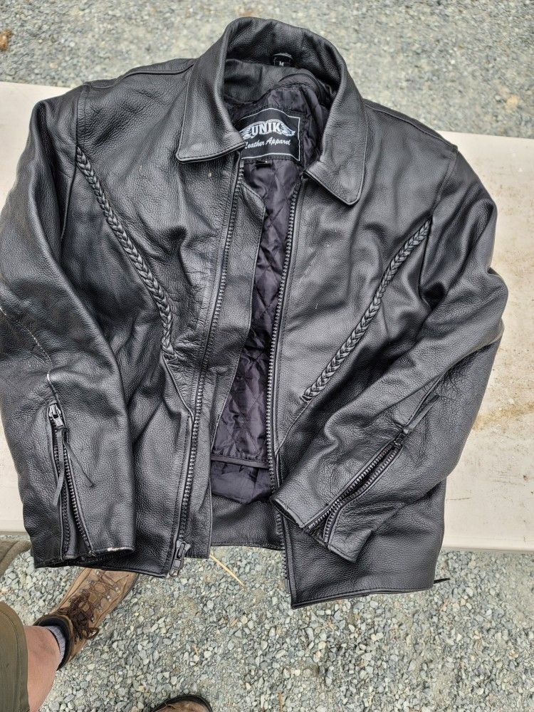 Women's size medium Leather jacket with removable liner Leather chaps with rose embroidery Harley Davidson fleece jacket with embroidery logo on back.