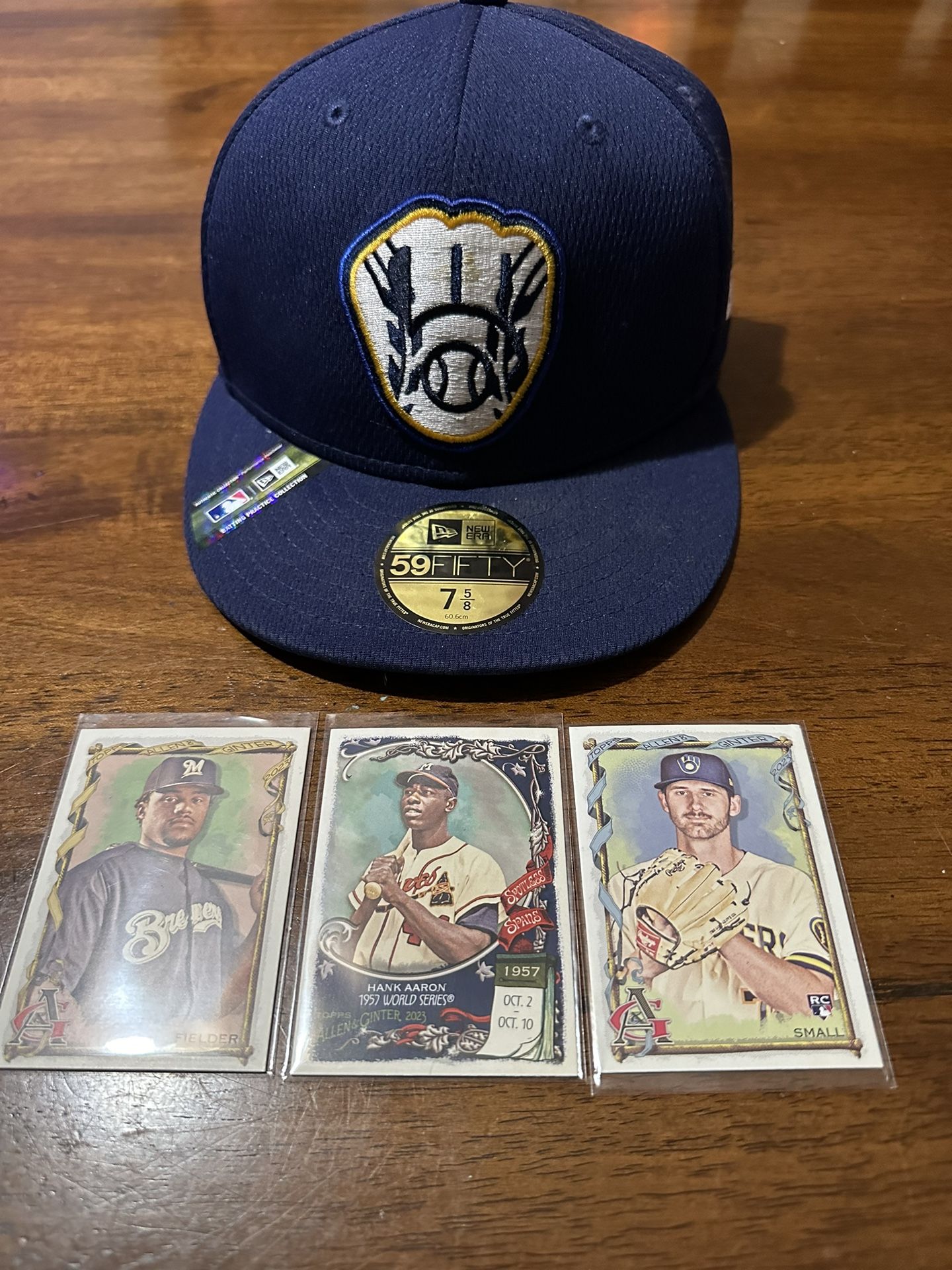 New era Milwaukee Brewers size 7 5/8 Allen and Ginter 2023 Ethan small Allen and Ginter 2003 Prince Fielder Allen and Ginter 2003, Hank Aaron spotless spans insert