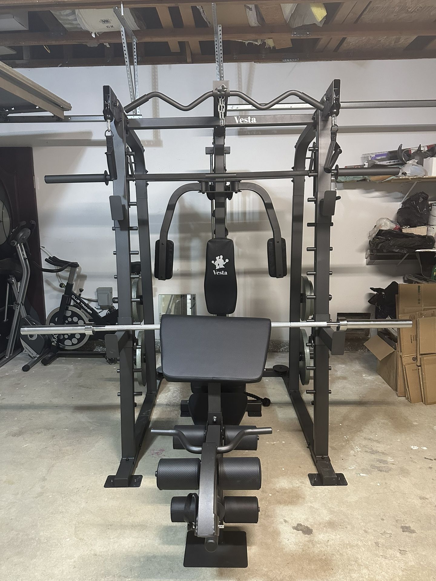 Vesta Fitness Smith Machine 2001 w/Bench Attachment | 230lb Bumpers Weights | 7ft Olympic Bar | Fitness | Gym Equipment | FREE DELIVERY 🚚