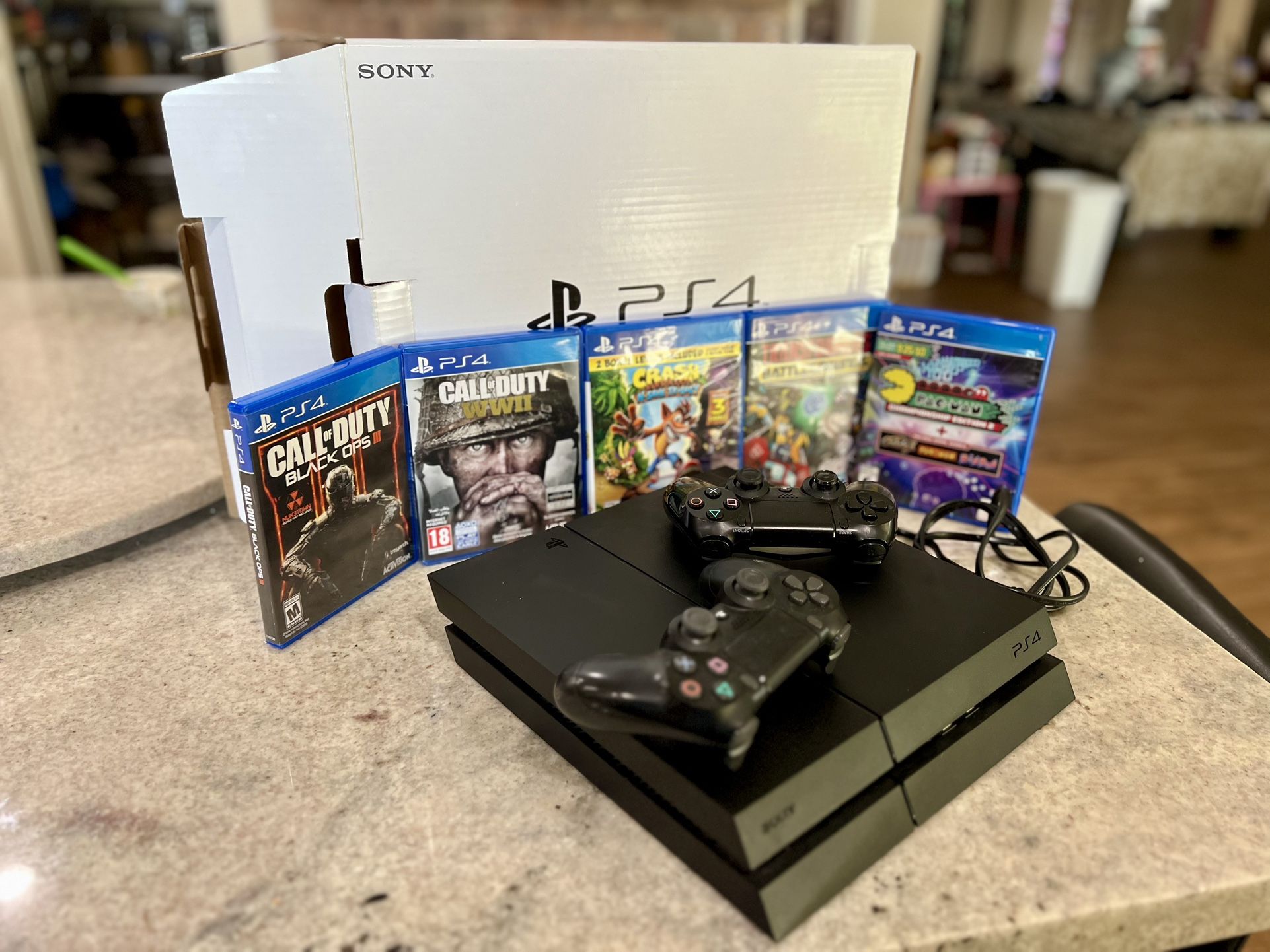 PlayStation 4 in great working condition. Adult-owned, clean, and tested. Includes: • PS4 console • 2 DualShock 4 controllers • Power & HDMI cables • Original box • 5 games (COD, Crash Bandicoot, Pac-Man, more) Ready to play. Local pickup – Phoenix Cash / Venmo / Zelle Serious buyers only.