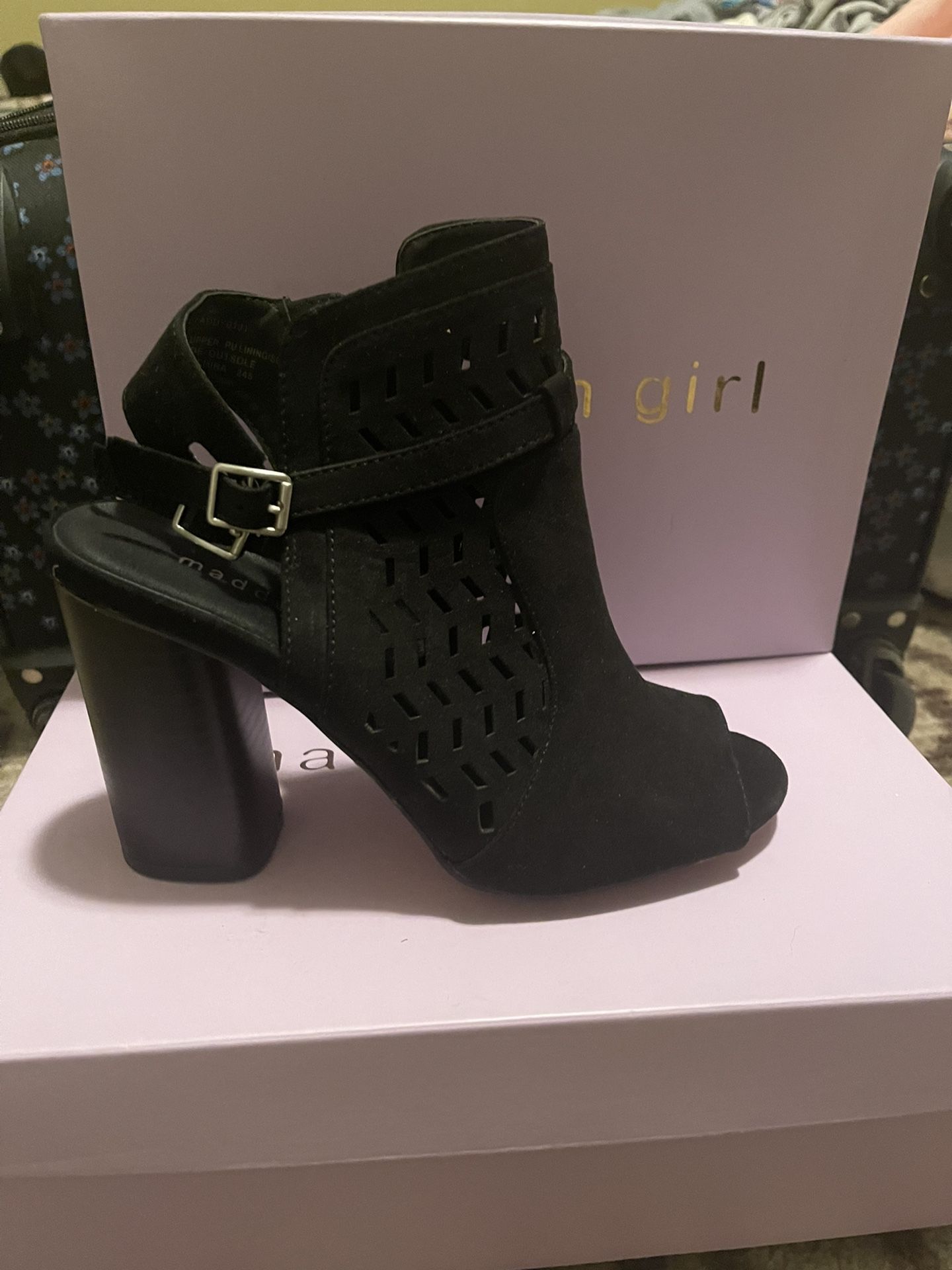 Cute chucky heels, strappy and peak toed.