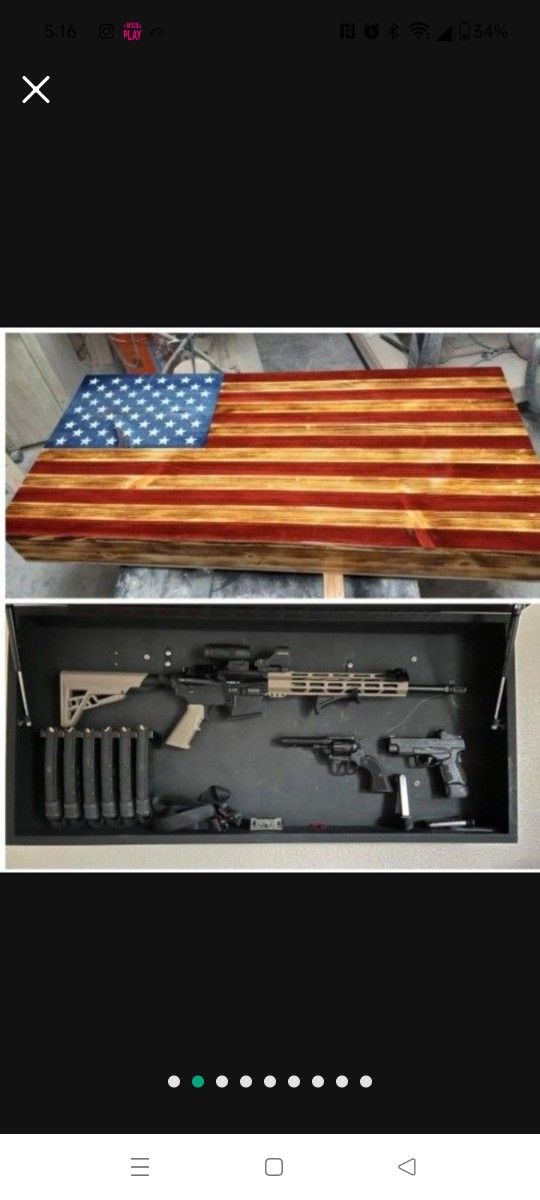 Handmade locally. Wood American flag safes comes in the styles pictured. Small 19x10.2.5 $200 includes lock and magnets Large 41x19x3.5 $400 includes lock and 2 magnets 59% deposit required Check me out on Facebook at Stars & Bars Wood Co Message me about doing custom orders or other wood products.