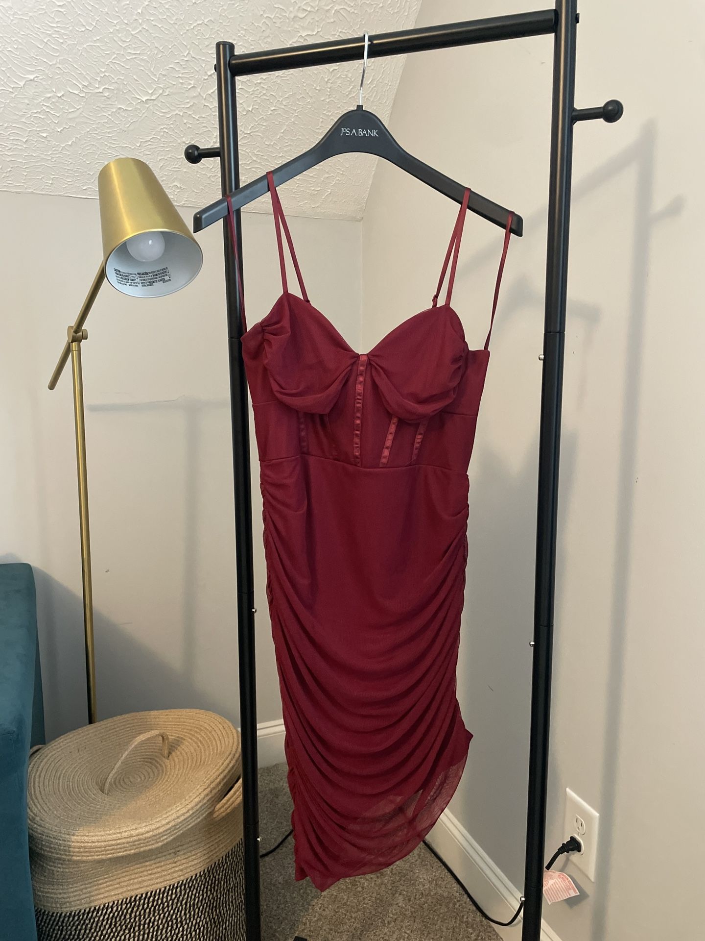 Maroon, lined, asymmetrical dress with a corset design. Used 1 time for a holiday corporate event