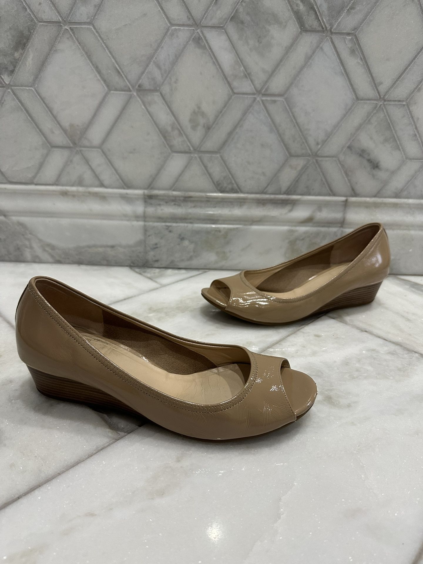 Size 8.5 Cole Haan Nike Air Tali Tan / Beige Peep Toe Wedge Heels