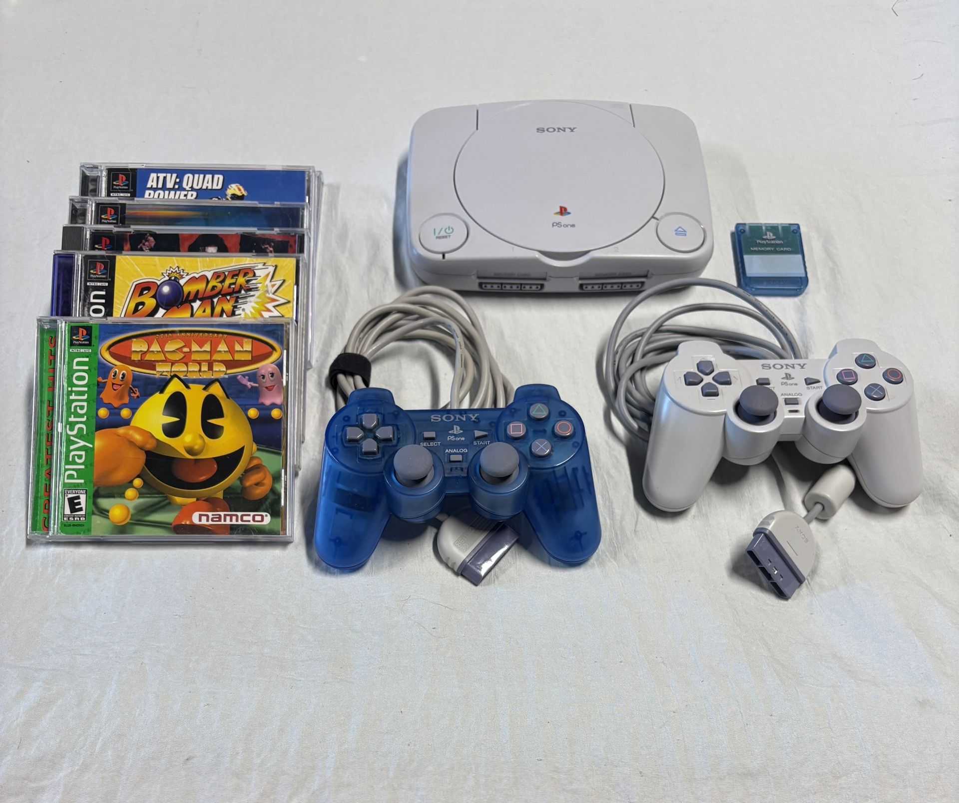Sony PlayStation slim version. Works great! Includes everything listed below. PS1 console Power & a/v cords 2 OEM dual shock controllers 1 OEM memory card 6 games