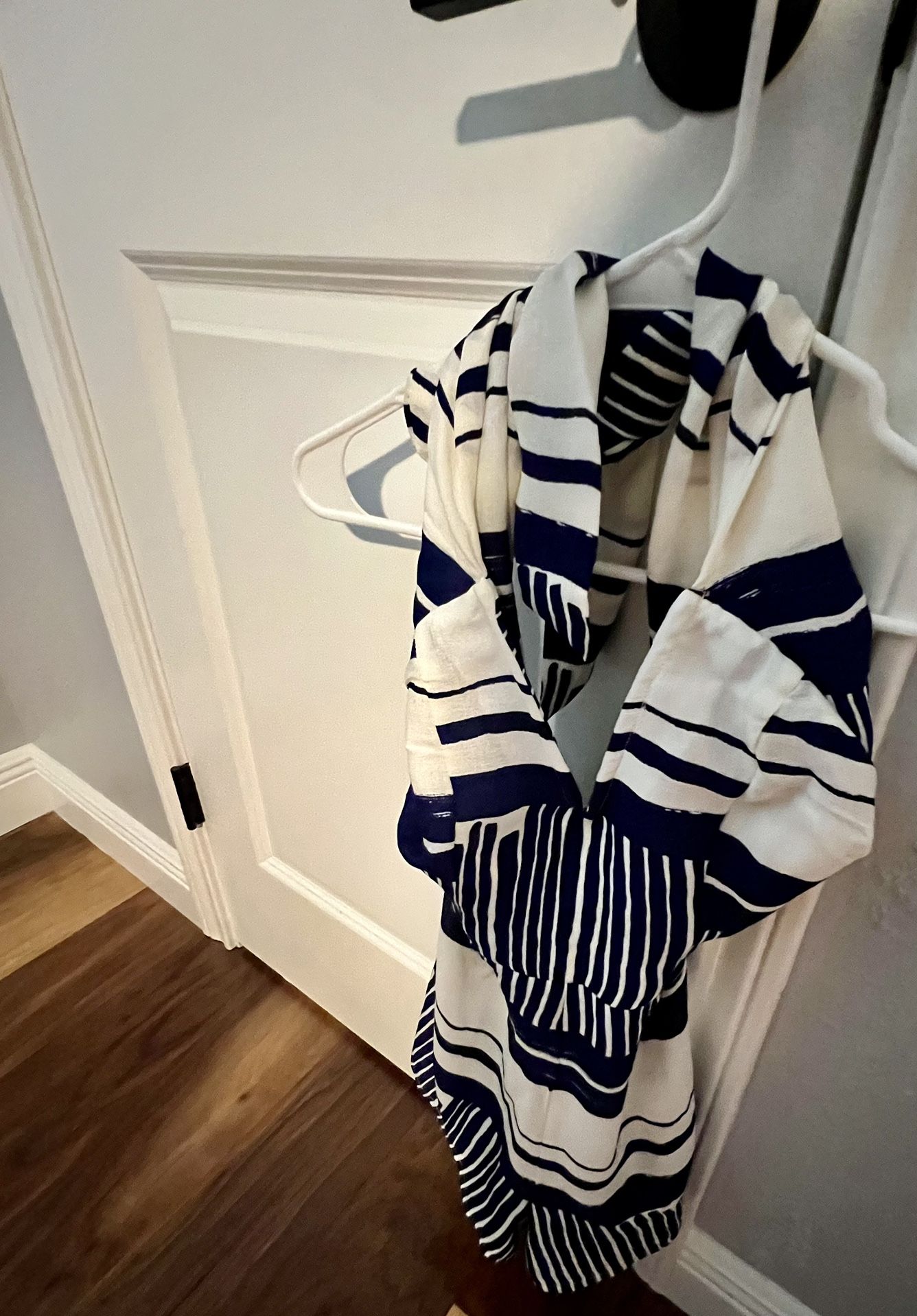 delphi blue & white stripes, strapless with a tie front. Size XS. Never worn!