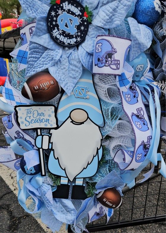 USC Christmas wreath large with a nome christmas attachment, footballs, UNC ribbon, tails, light blue poinsettias, and other embellishment. This wreath will look good on your front door, over the fireplace mantle or any place you desire. I will ship or you can pick up at the door.