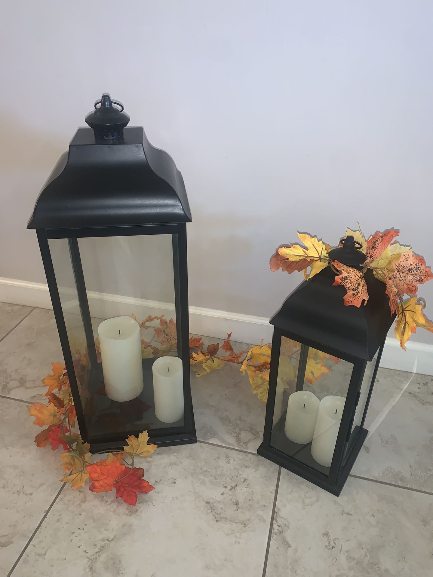 Selling lanterns great for the holidays! Selling both as a set, perfect for fall and winter let me know if you're interested! 11 Inch in width 28 inches in length for the large one 8 inch in width 22 inches in length for the small one. DOES NOT COME WITH CANDLES OR FALL DECORATIONS WILLING TO NEGOTIATE THE PRICE