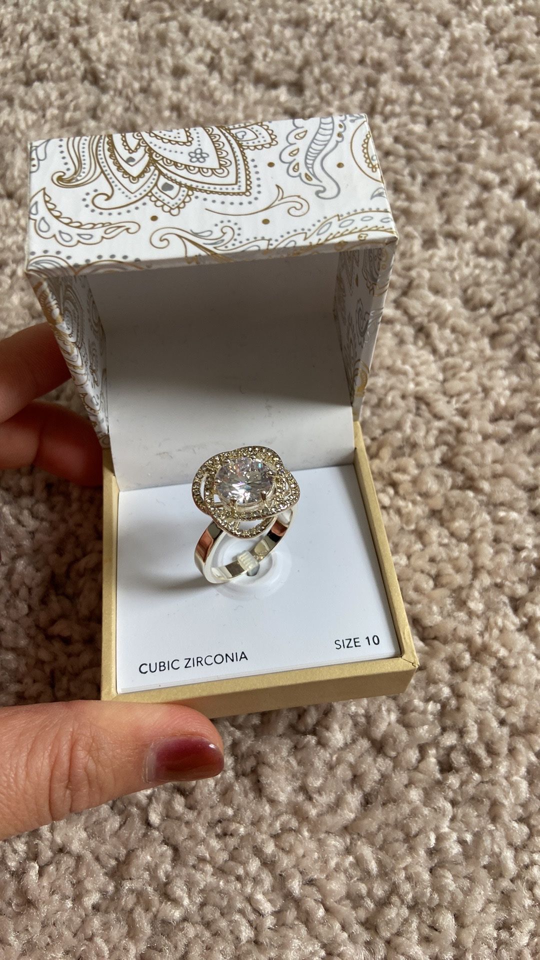 New in box. Never worn new. Silver tone ring with CZ. Size 10. Ring is attached to box. In perfect new condition.