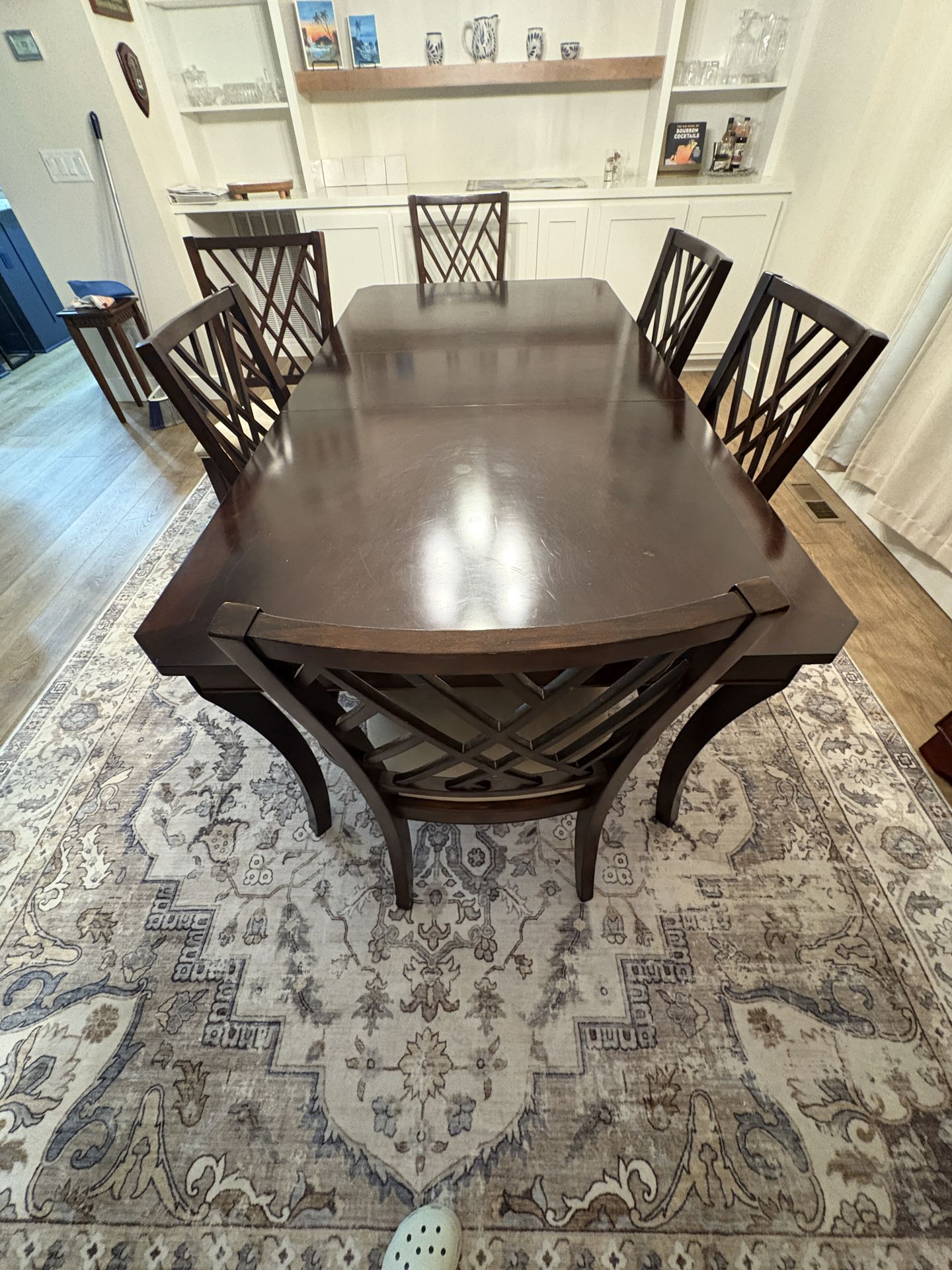 Very sturdy 90” long( 78” without leaf) by 44” wide by 30” tall 6 chairs including 2 end chairs with arms. Walnut colored wood. All chair fabric is in good condition no tears. Minor scratches and blemishes on chairs. Table has a few marks as well.