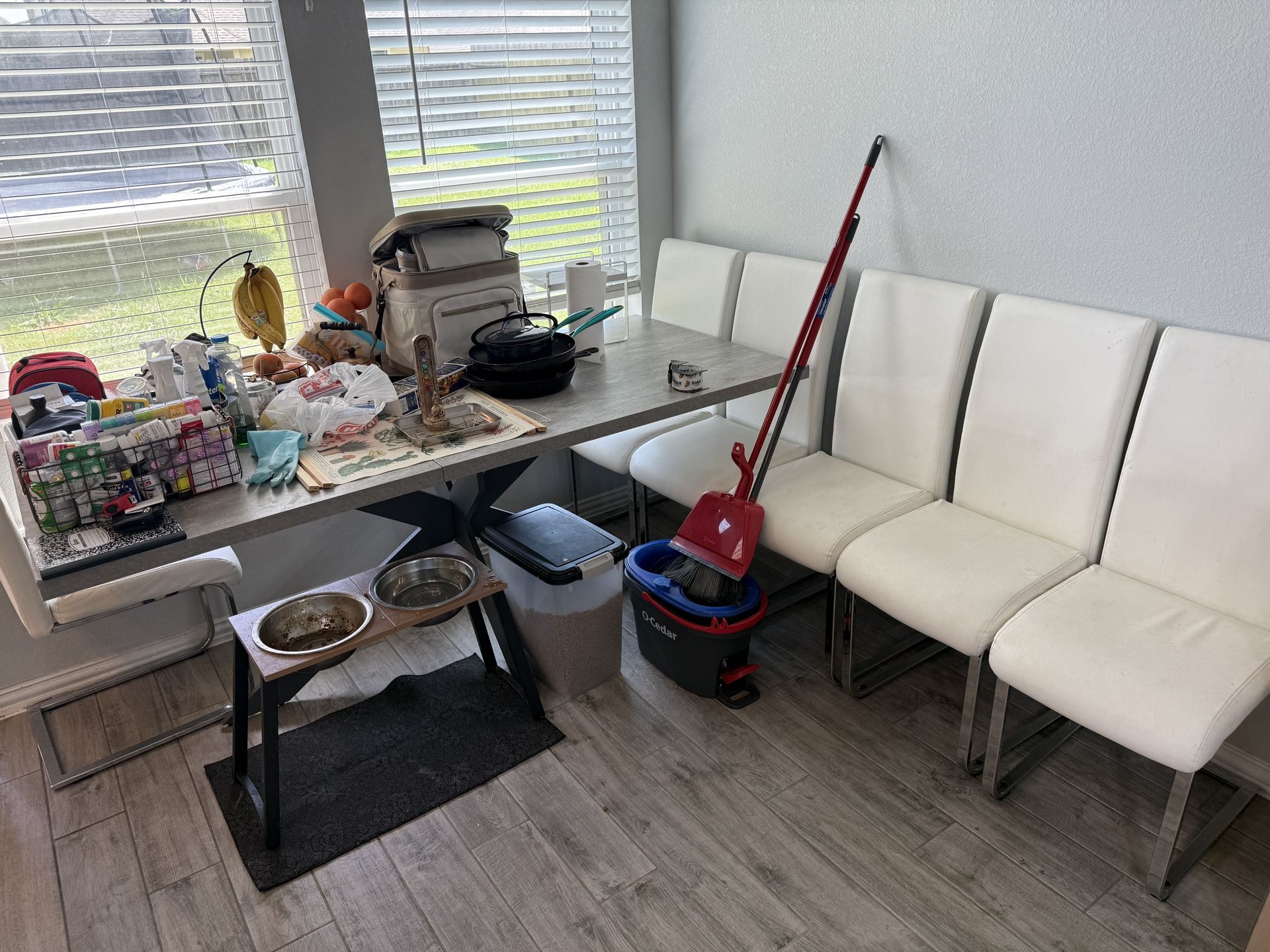 78” long X 34 5/8” wide. Concrete/stone color vinyl over wood. Grey metal legs. 6 white chairs go with it. Bought for $700 on amazon last year without chairs. Small blemishes on 2 corners.