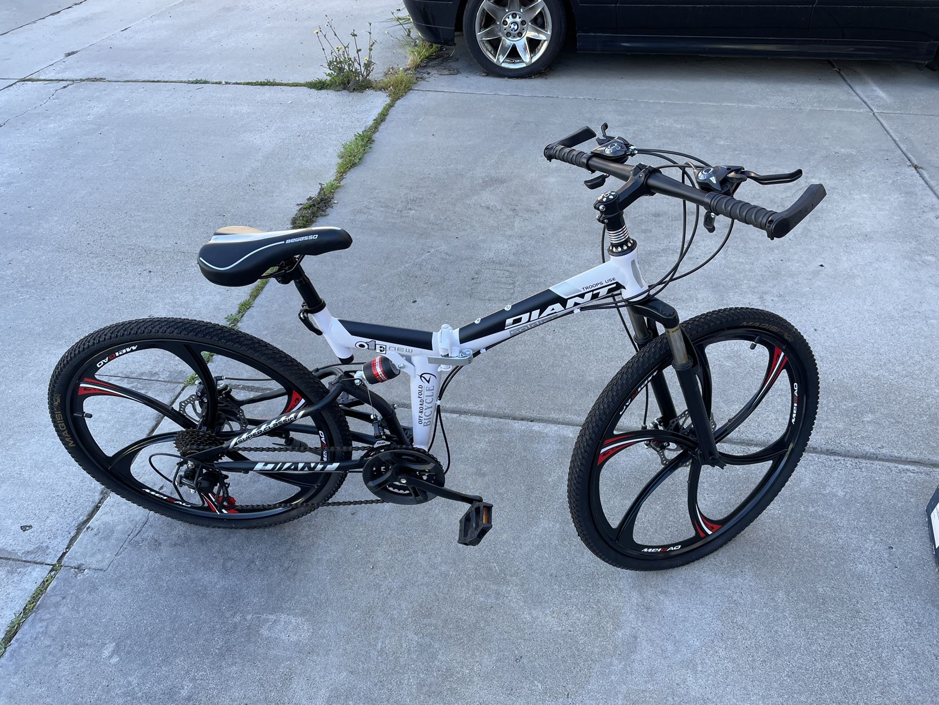 Brand new 26” 21 speed FOLDING bike. This bike can easily be folded in half for storage or fit in a trunk. It has front shocks for off-roading, an adjustable seat depending on your height, and it has the upgraded handle bar with hand guards. Not desperate to sell, just going to put it in my storage unit if need be. Located in University Heights