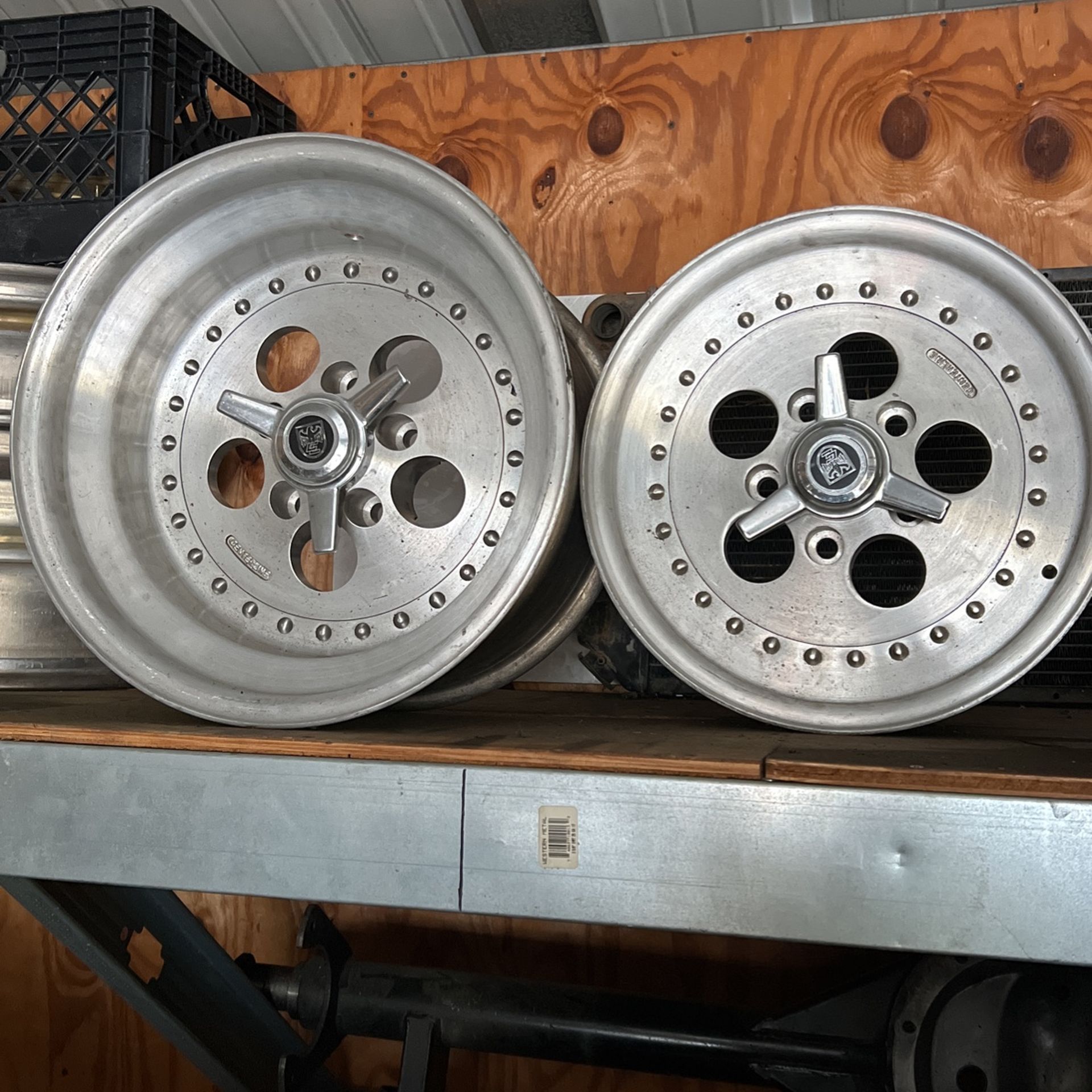 Vintage centerline, racing, wheels, 1970 with knock off caps rear 17x10.5..4.5 offset Front 16x6.5. 3.5 offset. 5x4.5 lug pattern