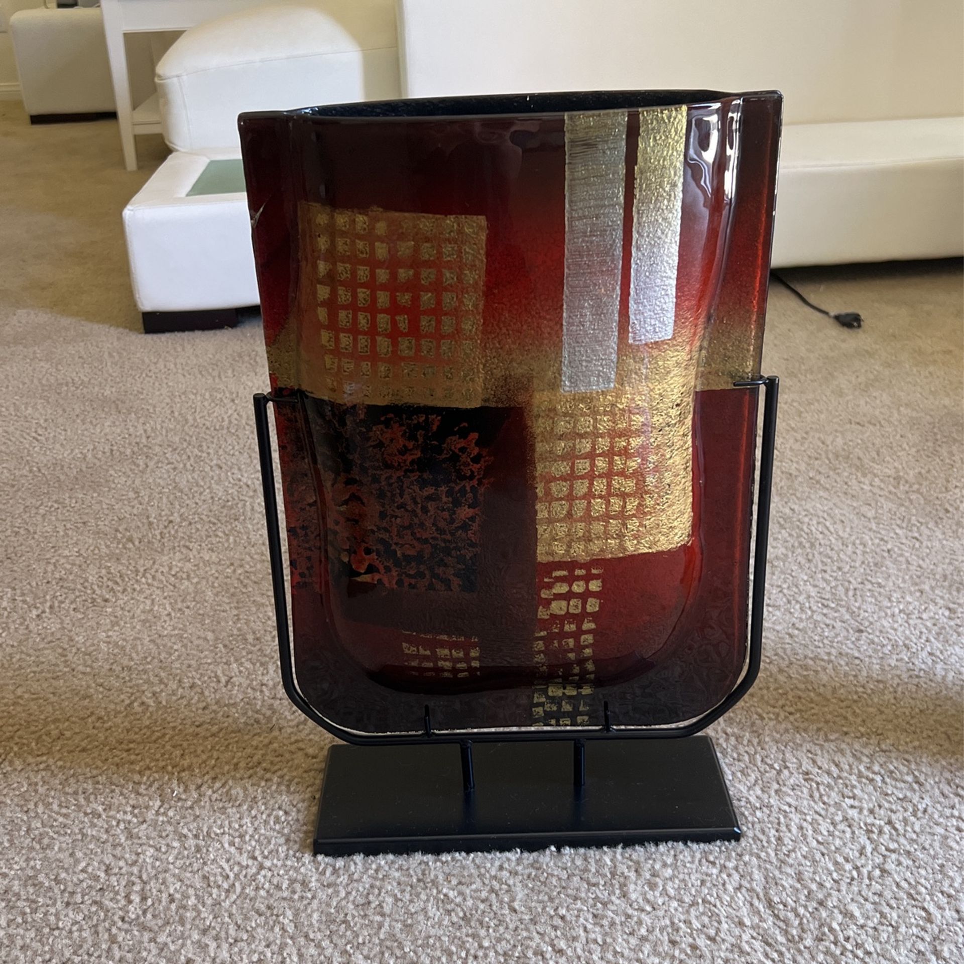 Every handmade piece of art glass is unique and because it is hand painted may not be exactly as shown. Golden City U Vase 19in in red, black and gold, on a stand.
