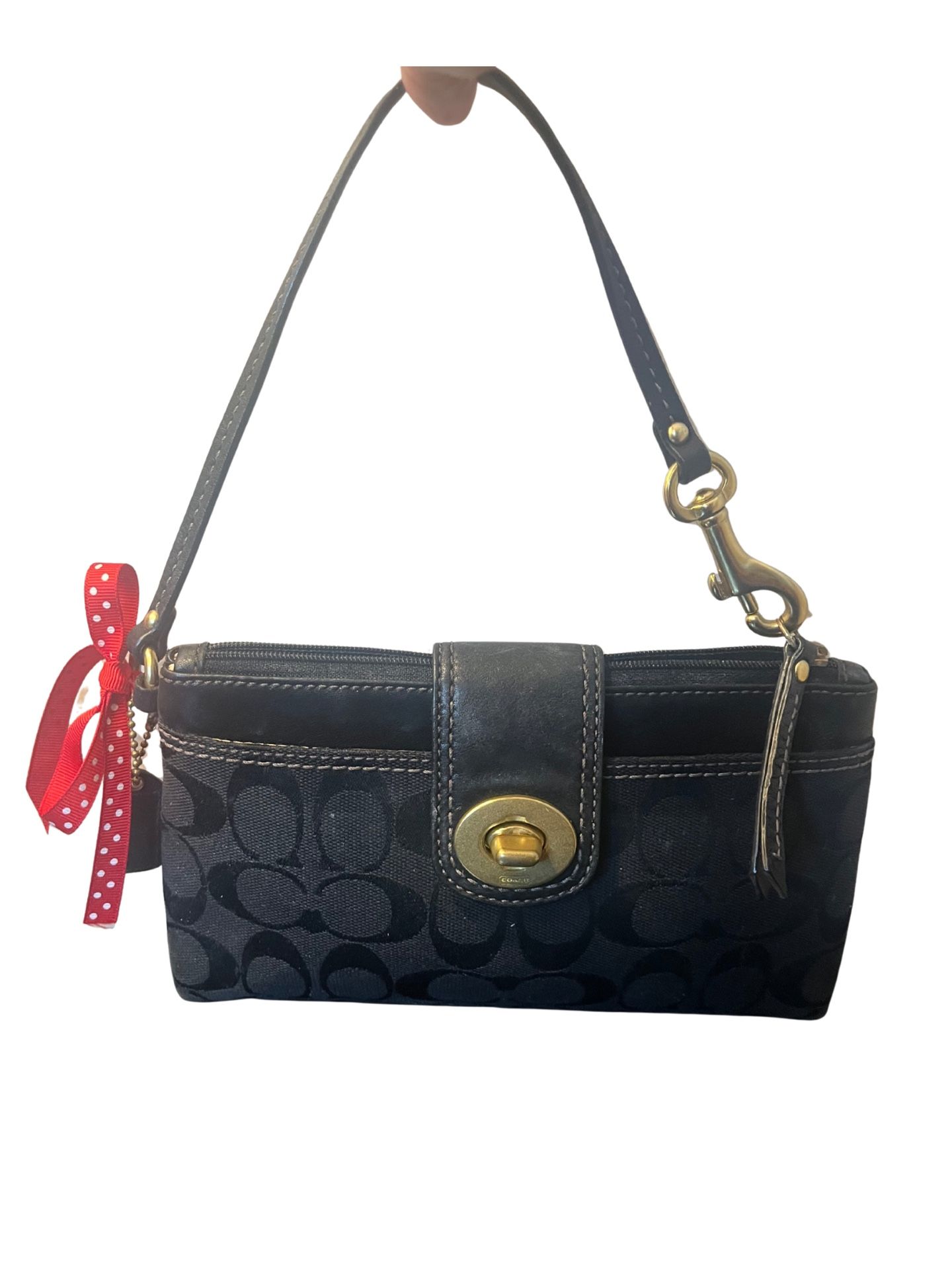 Coach Signature Canvas & Leather Turnlock Small Wristlet is an absolute cutie & vintage piece to add to your Coach collection. Features a turn-lock closure with a front slip pocket. Exterior canvas is in great condition with some minor fading to leather trim as shown. Interior is fabric lining, clean no rips or stains & 1 slip pocket. Has zip top closure & brass hardware. This is great for on the go pairing with your favorite pair of jeans, dress or comfy attire. Add a bag extender to wear as a cute mini shoulder bag as well. Approximate measurements Bag Width 8" Bag Height 5.5" Smoke free home. Please see all pics & feel free to ask me any questions