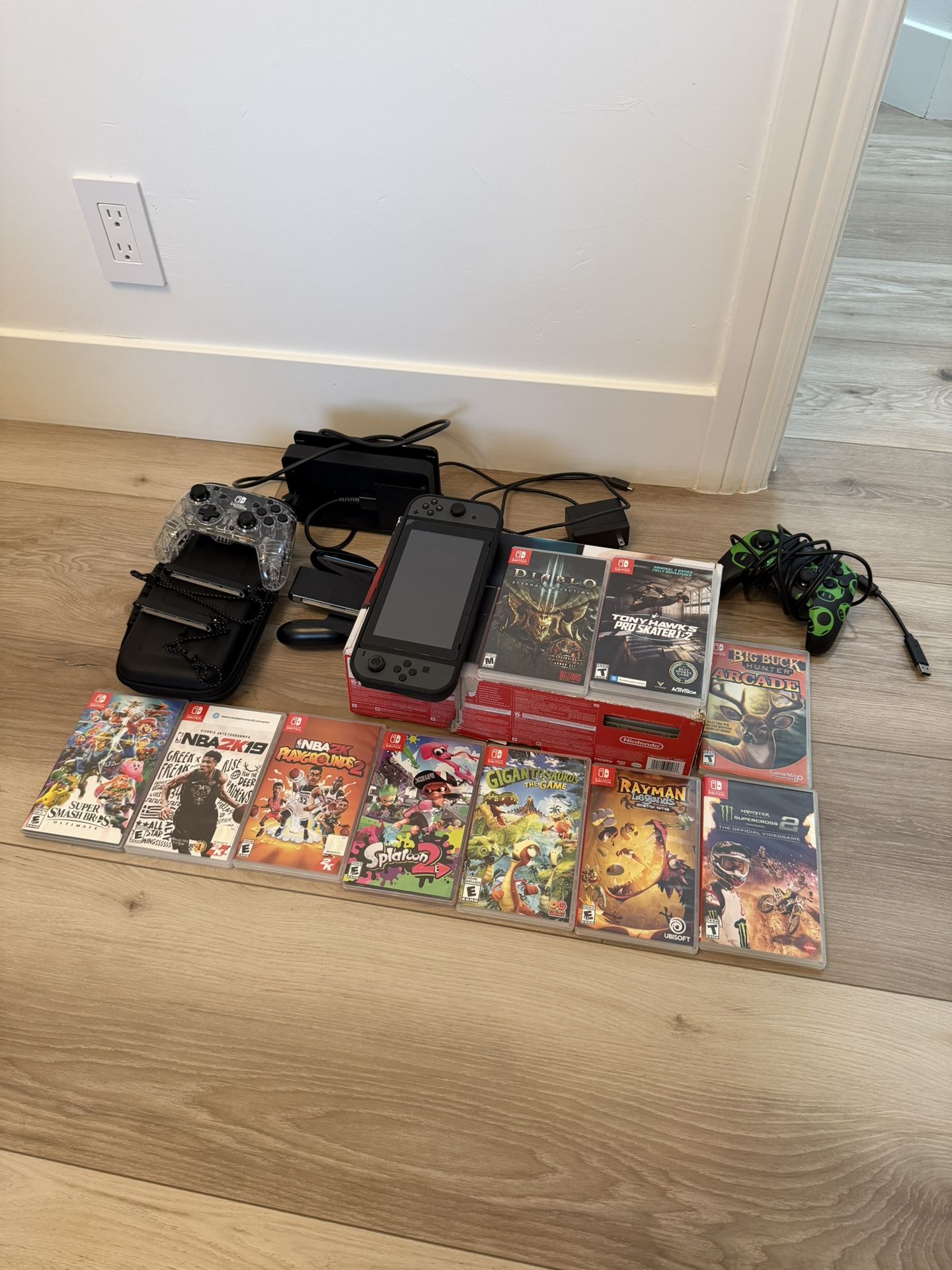 Nintendo Switch Bundle - Console, Games, Controllers & Accessories Selling a Nintendo Switch bundle in like new condition. Everything shown in the pictures is included. Includes: • Nintendo Switch console (tablet) • Nintendo Switch dock • Power cable & HDMI cable • Controllers (Joy-Cons + additional controllers shown • Carrying case • Physical game collection: • Super Smash Bros. Ultimate • NBA 2K (multiple editions shown) • Splatoon 2 • Rayman Legends • Gigantosaurus: The Game • Tony Hawk's Pro Skater • Diablo I|l • Big Buck Hunter • Monster Energy Supercross • And more (see photos for full list) Condition: LIKE NEW • Console and games work great • No major damage Perfect starter bundle or gift - lots of games and extras included. Selling as a bundle only.