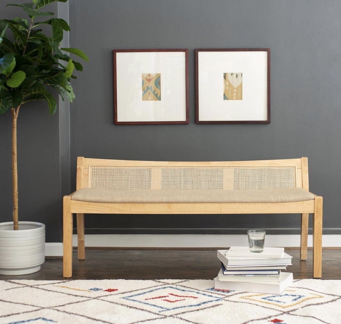 Modern style woven rattan bench with natural color finish and part of the Kasi collection. Made with sturdy and durable engineered rubber wood. Product dimensions are 18.75 inches (D) x 52.36 inches (W) x 23.37 inches (H). Seat height is 17 inches. Frame material is wood with cross hatched basketweave design with padded seat upholstered in a beige linen fabric.
