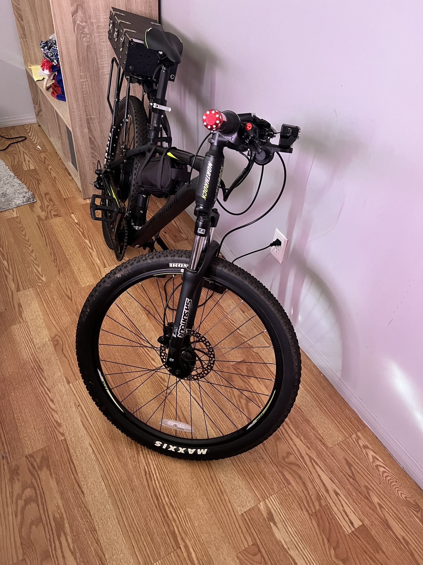 Custom Electric Mountain Bike – 72V High Power Build Large size. Custom-built electric mountain bike conversion. Not a stock e-bike. Built for speed, torque, and long rides. • 72V 20Ah lithium battery (~1,440Wh) in a custom rear hard case • High-power rear hub motor • Pedal assist + throttle • Estimated top speed: 45+ mph (conditions dependent) • Disc brakes with hydraulic system • Front suspension fork • Shimano drivetrain • 27.5” wheels with Maxxis tires • High-output LED front light • LCD display • Rear cargo rack • Kickstand installed Estimated range: ~25–35 miles aggressive riding / up to ~40–55 miles with pedal assist Charge time: ~4–6 hours Rear-heavy due to motor and battery. Best for experienced riders. Recommended for commuting only. Not meant for trail riding. Serious build – serious buyers only. Message with questions.