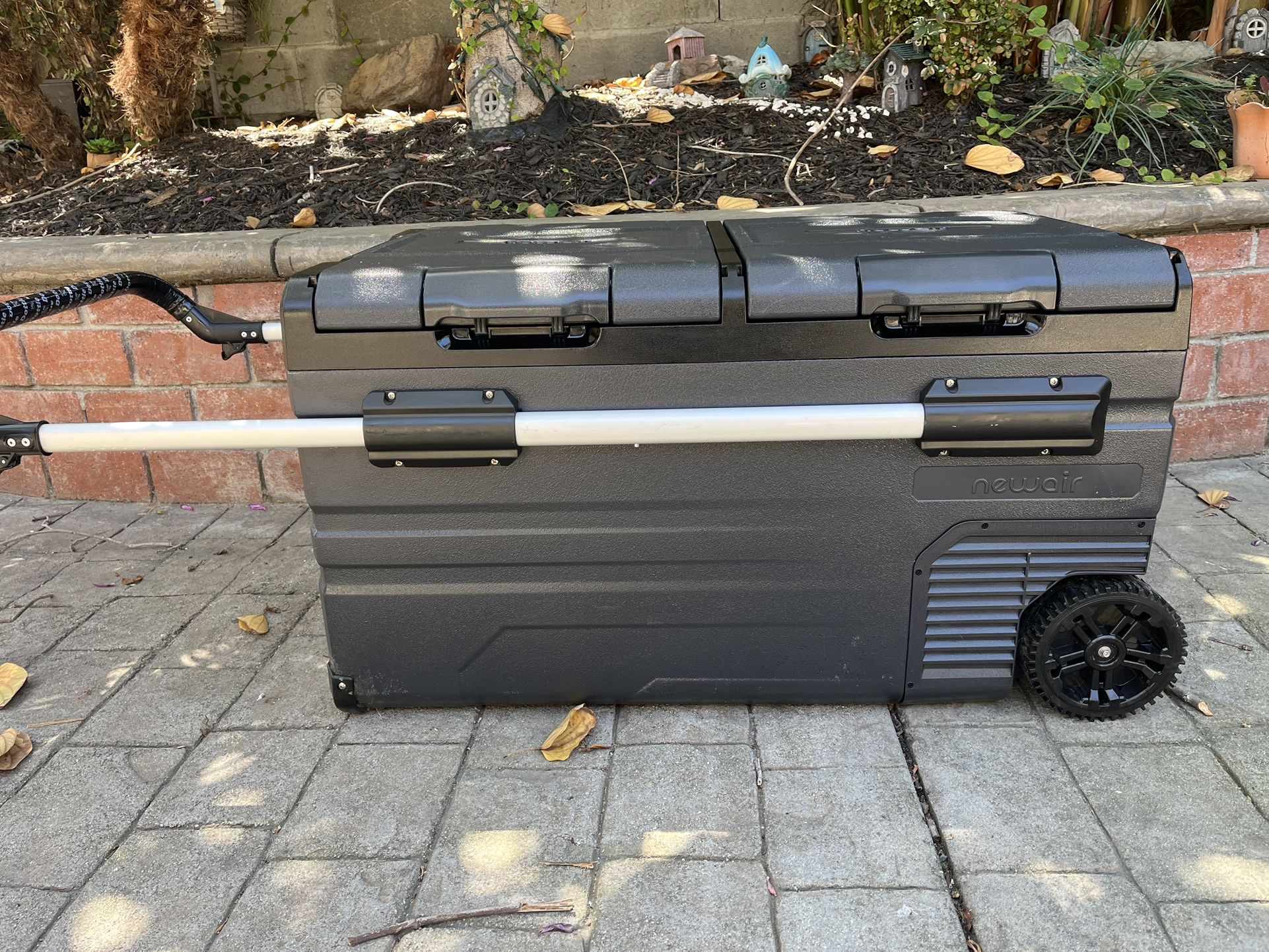 Newair 80 quart 12v electric cooler. Used only a couple of times. 2 compartments, dual zone, you choose temp. Can be used as freezer/fridge or both freezer or both fridge. Useful for camping. Handle and wheels for easy move. See pictures for specs.