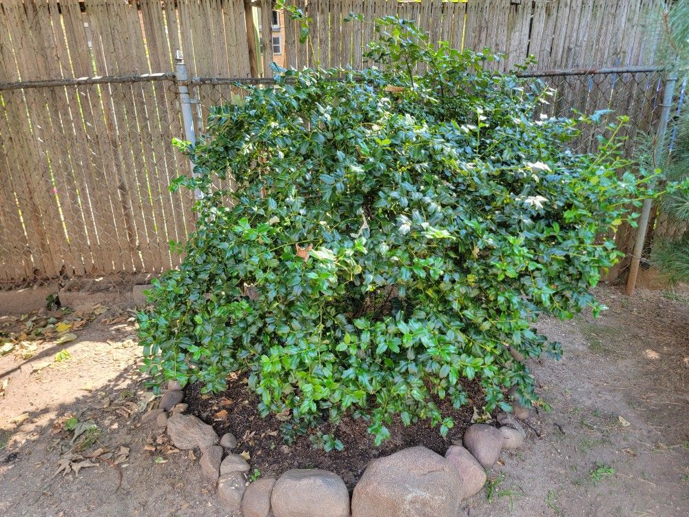 4ft tall 3.5ft wide In ground must be dug up Cash only pick up only This is a china blue girl holly bush always makes berries very pretty
