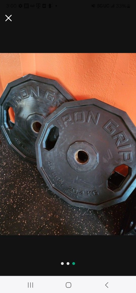 PAIR OF 45s IRON GRIP OLYMPIC RUBBER COATED PLATES ( EXCELLENT CONDITION )