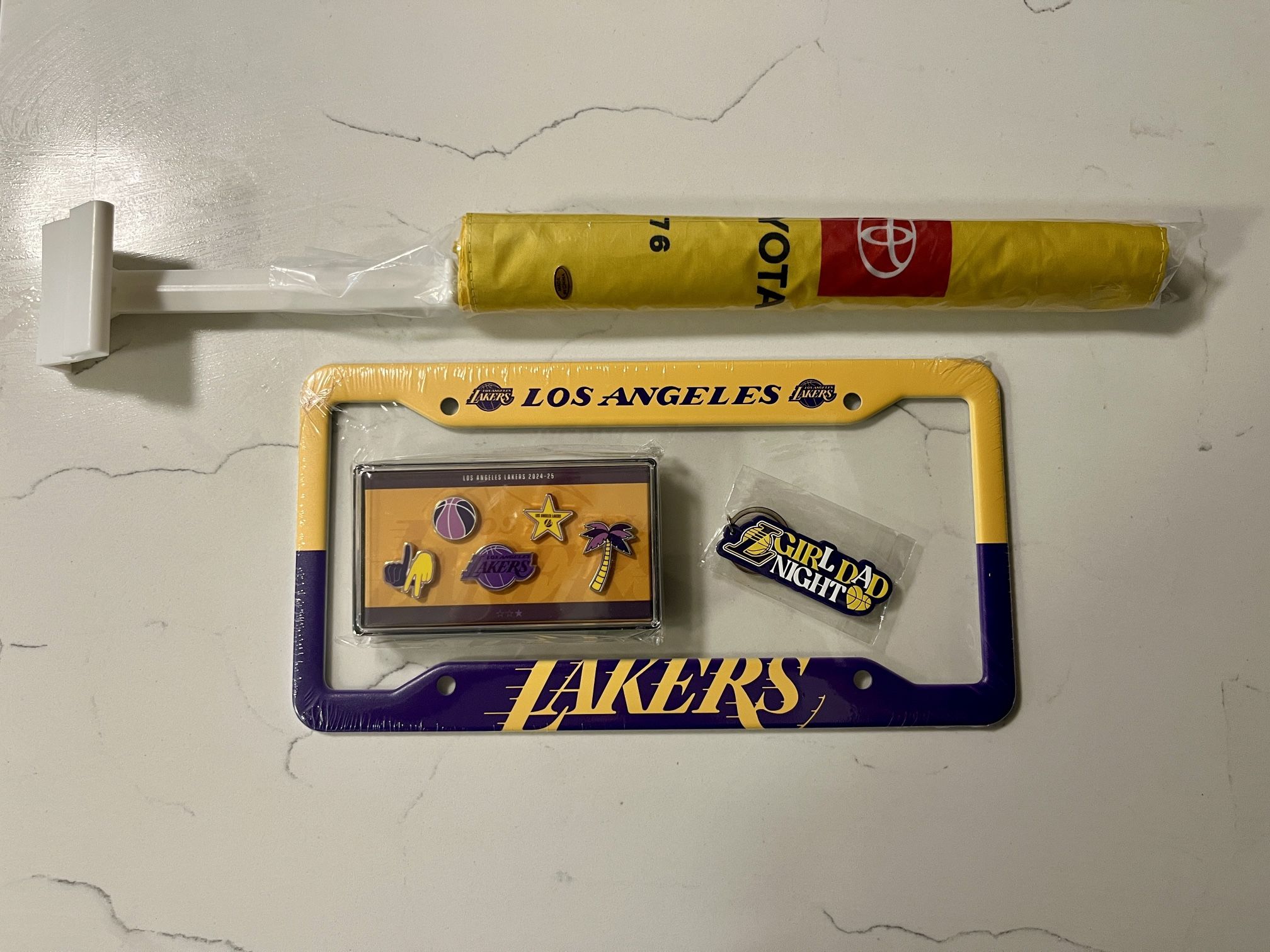 Lot includes all four (4) items pictured: - 2024-2025 Pin Set #3 - Purple & Gold License Plate Frame - Girl Dad Night Keychain - Lakers/Toyota Car Flag Asking $30 Available for pickup in Burbank