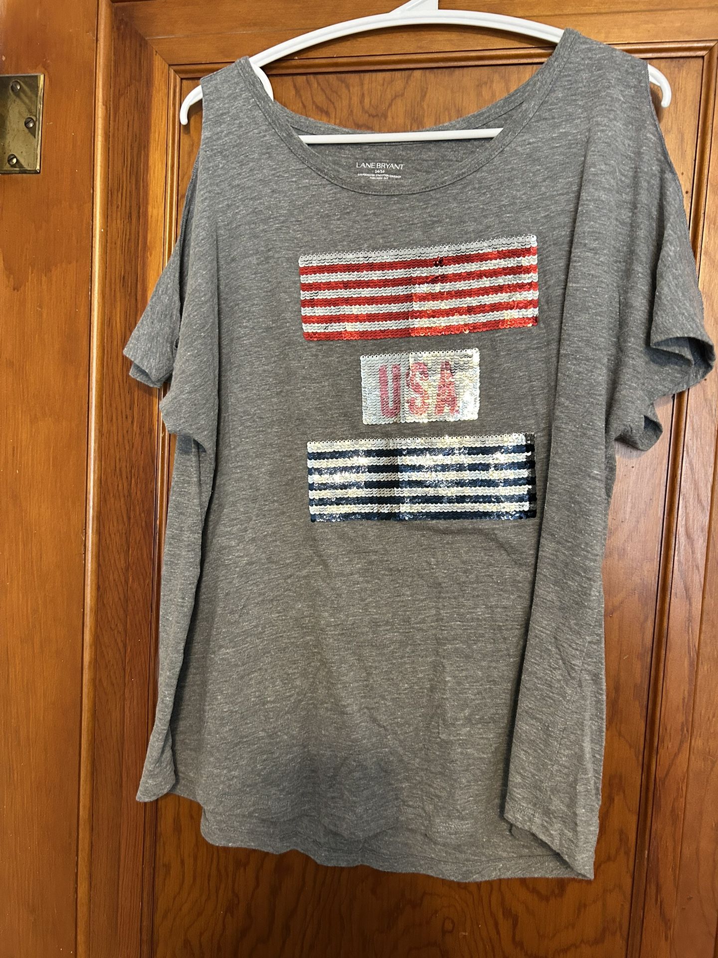 Gray top from lane Bryant size 14/16 sequins can say USA or be pushed up to say Stars and Stripes