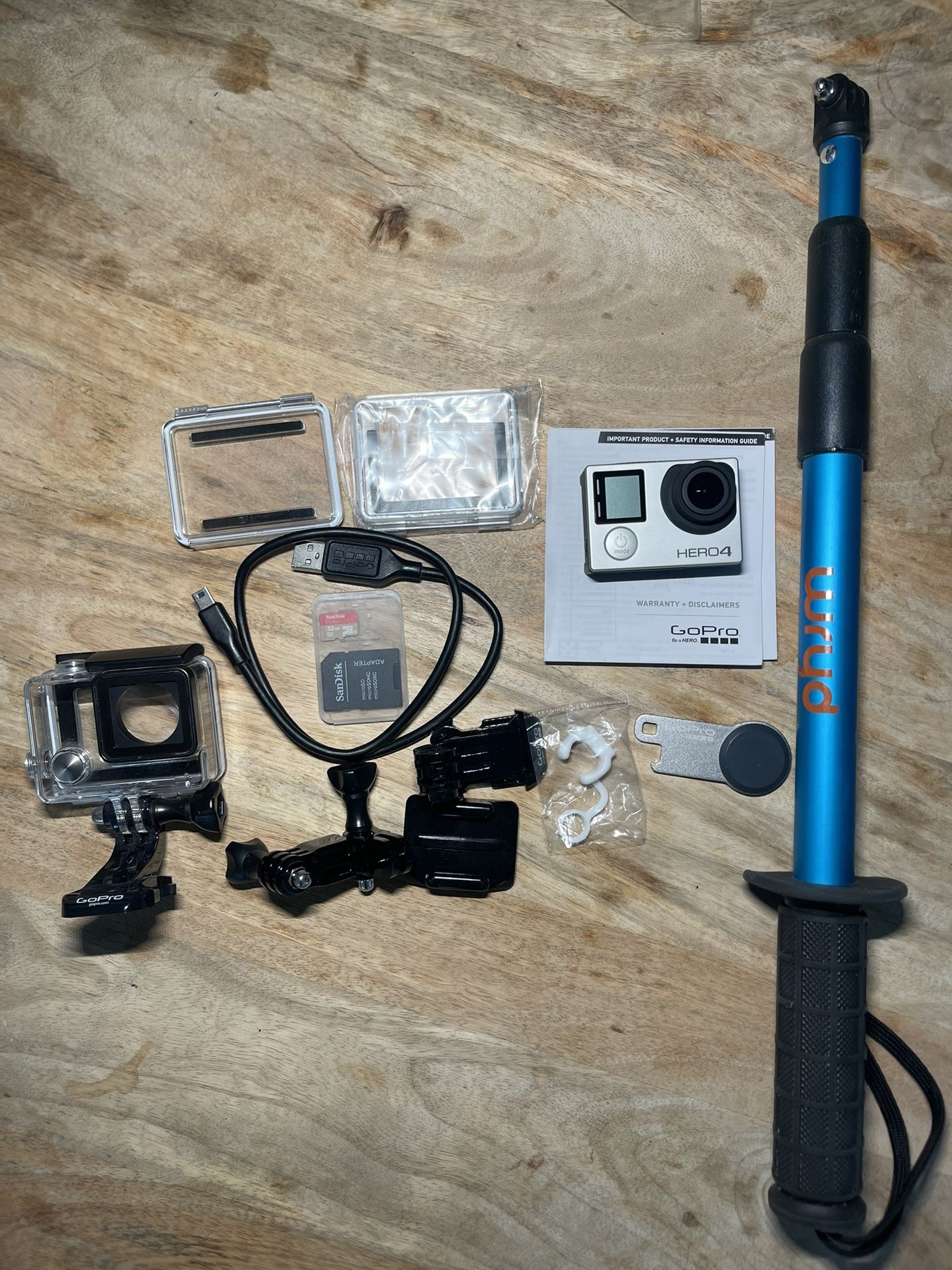 GoPro Hero 4 Silver. Only used a few times. Always inside the waterproof case. 32 GB SD card. Floating grip and stick.
