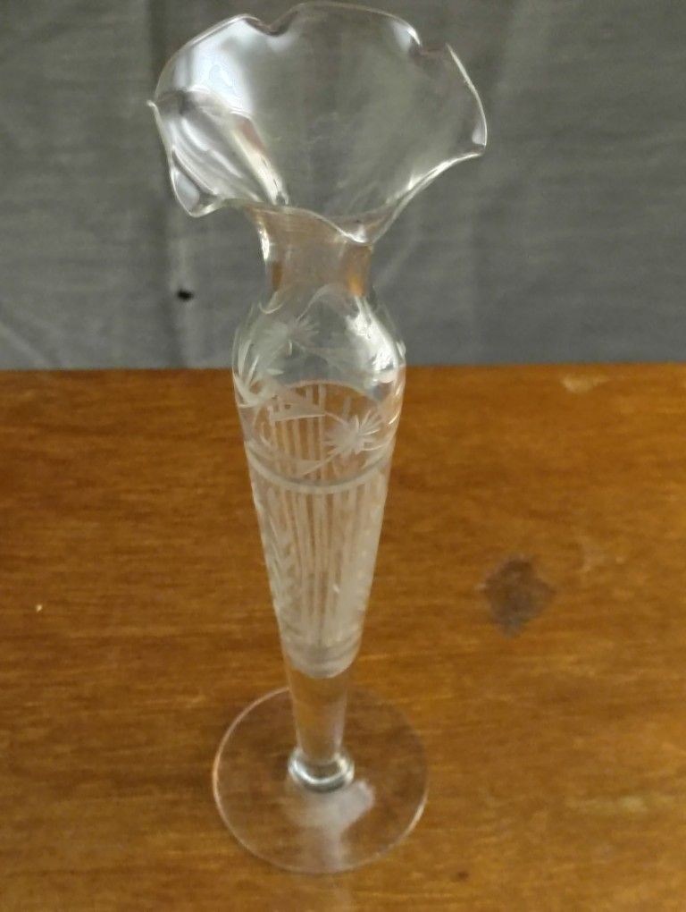 Vintage Art Glass Clear Glass Wheel Etched lines And Floral Design