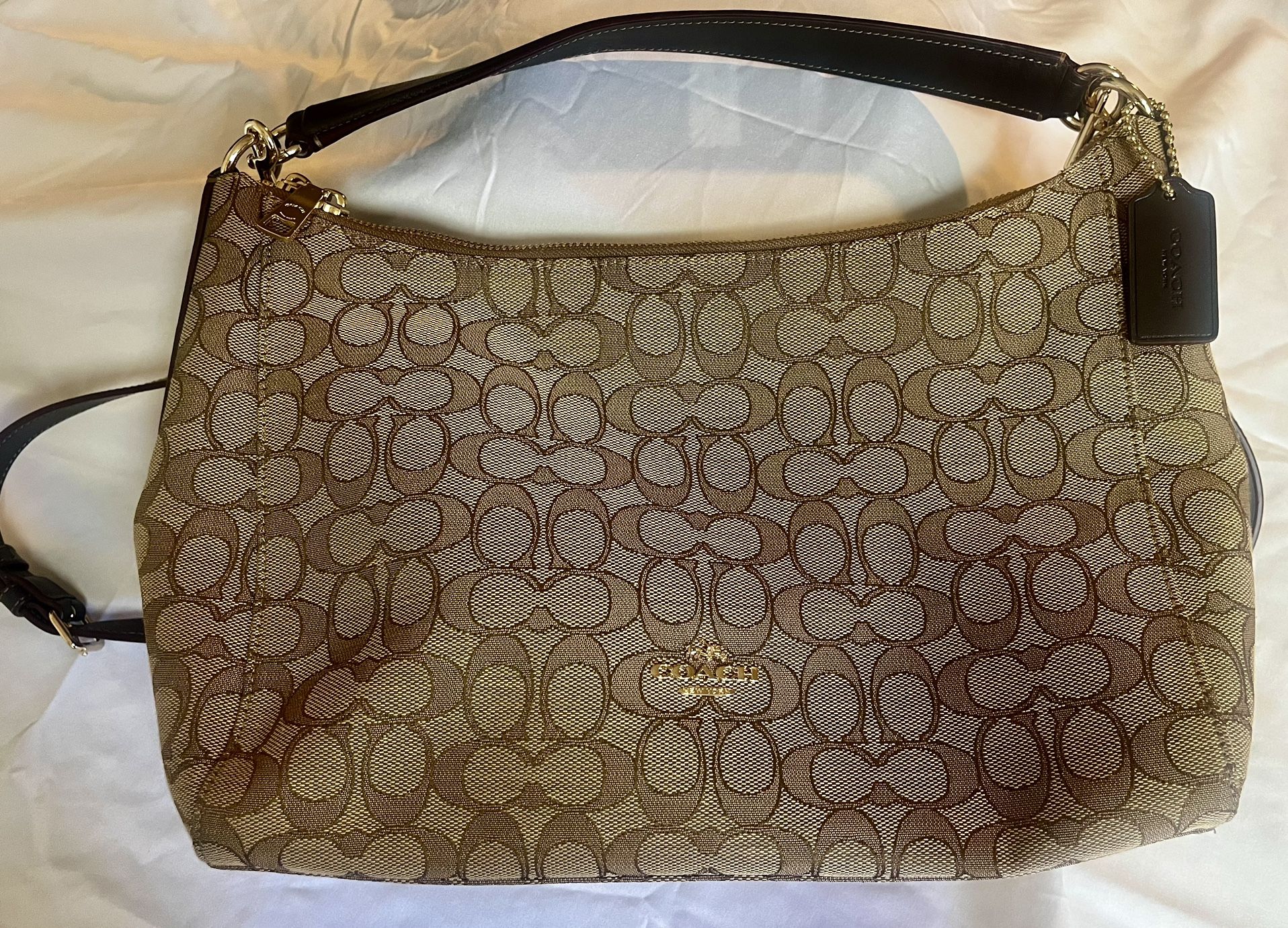 This is a Coach - Teri Hobo Bag (Signature Canvas). It is barely used, in great condition. The only sign of wear is in the inner zipper pocket. There is a pin head size pink dot. Asking $150