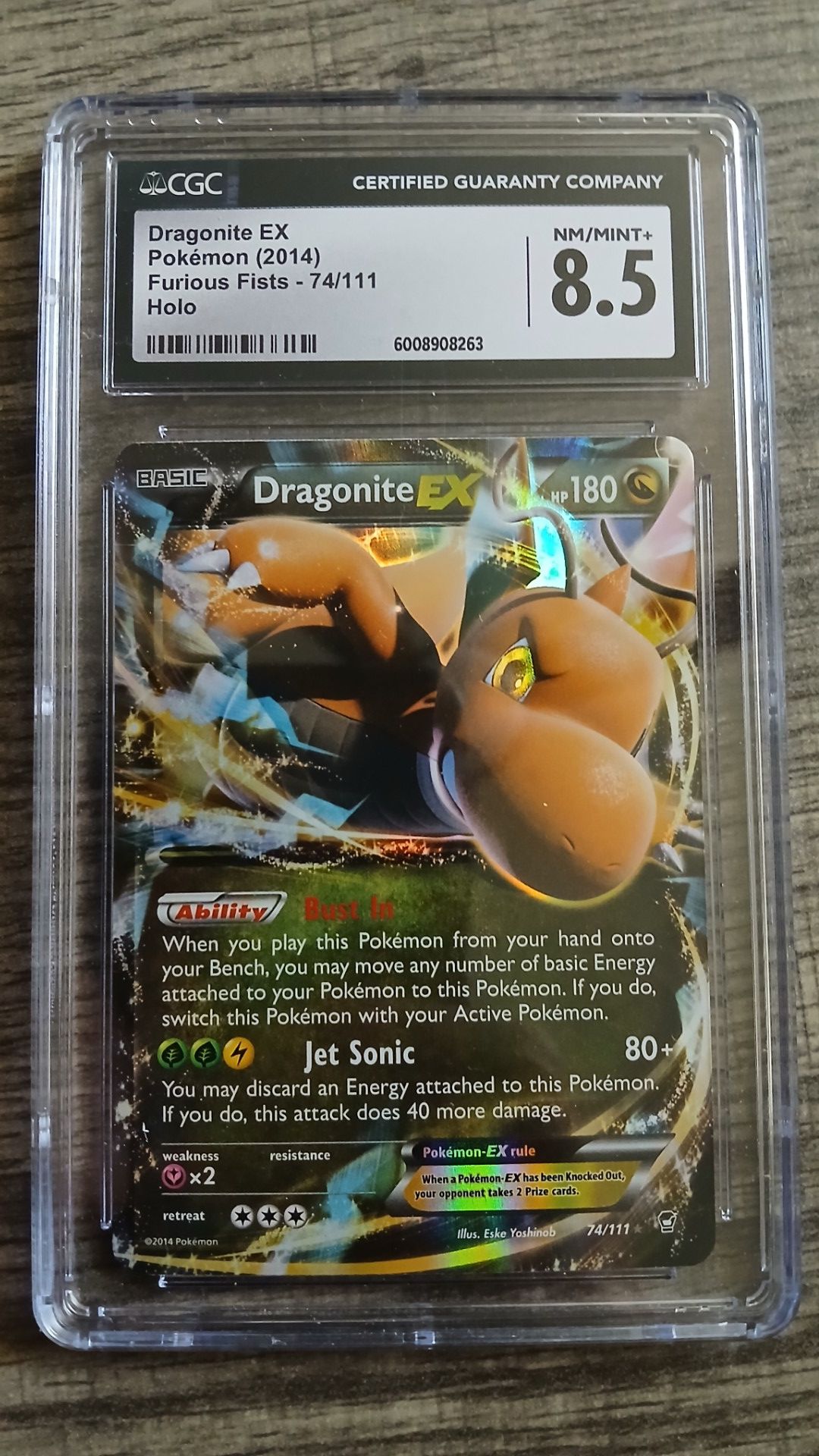 2014 Pokémon XY Furious Fists Dragonite EX #74, certified by CGC with a grade of 8.5 (NM/MINT+). Pokemon