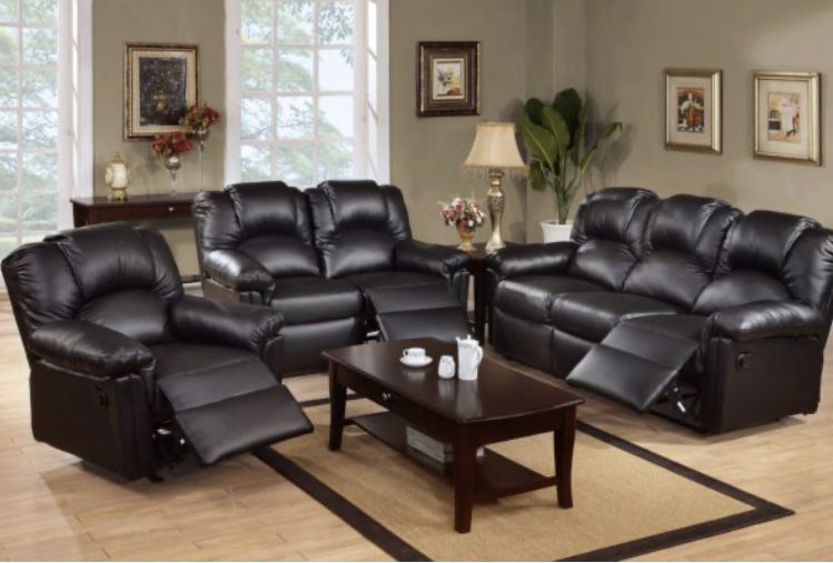 Sofa, Love Seat & Recliner Chair Item # F6671 Love Seat Item # F6672 Sofa Item # F6673 Recliner Color: Black Materials: Bonded Leather Hardwood Metal Some Assembly Required Dimensions: Loveseat: 60″ x 38″ x 40″H Sofa: 82″ x 38″ x 40″H Recliner: 38″ x 38″ x 40″H