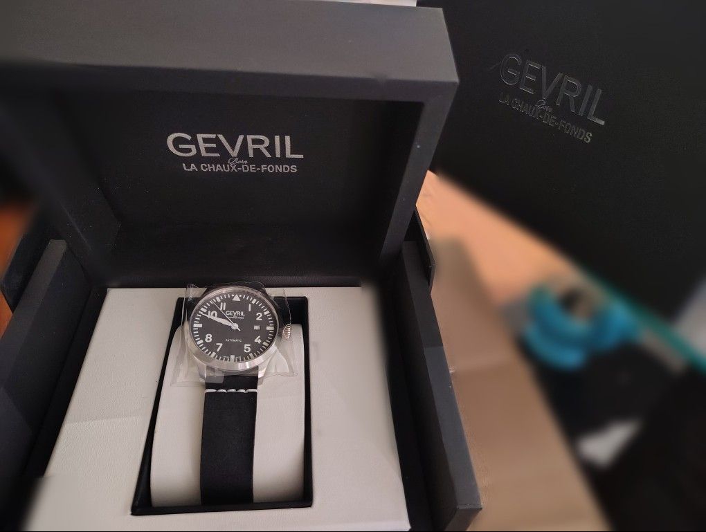 EXCELLENT XMAS PRESENT. Brand new price is $3,495 Asking price is $1,500 OBO Brand new in box with all parts/papers/cards This exquisite piece comes from the Vaughn collection by Gevril. Exuding the aura of audacious grandeur, each masterpiece is a testament to Swiss precision, powered by an automatic heartbeat that resonates with the legacy of aviation mastery. In the embrace of an authentic Italian CAF scan leather strap adorned with subtle stitches reminiscent of artisanal perfection, every glance bestows a sense of unparalleled craftsmanship. Within the heart of the watch luminescent hands come to life, encase within an anti-reflective sapphire crystal shroud