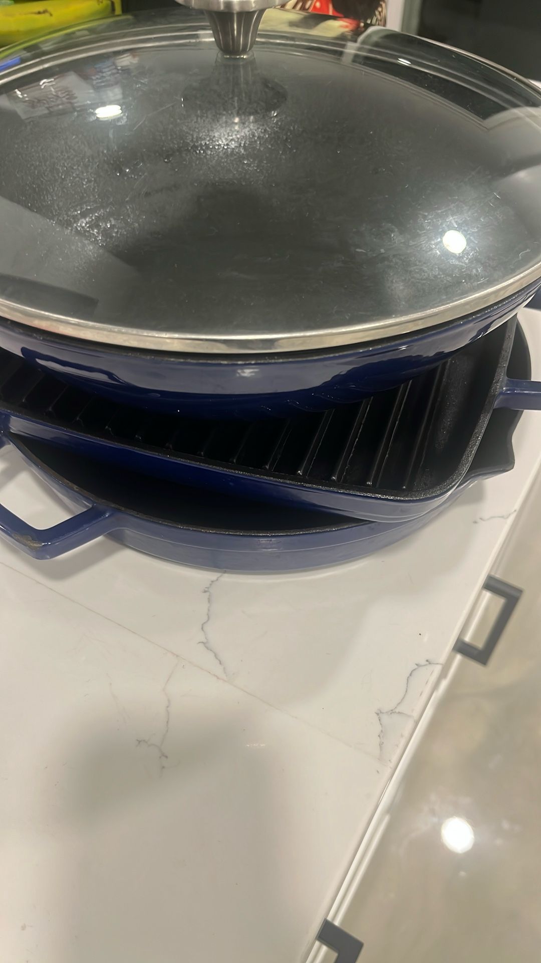 Perfect for the Holiday Parties! Beautiful Blue Have glass lid that you can use for the wok or the skillet. You can bake and cook. 4 pieces Individual $25.00 each All for $60 Wok comes with lid and also fits the skillet