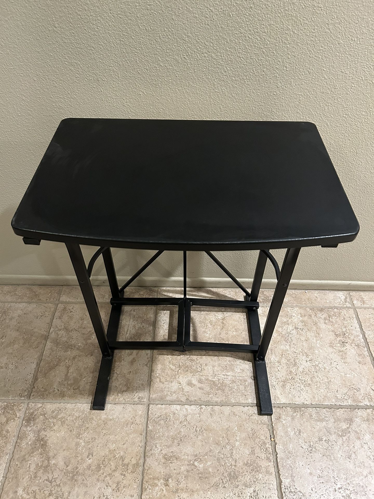 This sleek black foldable desk is perfect for small rooms, apartments, or as a temporary workstation. With a sturdy metal frame and a smooth rectangular top, it offers both function and minimalistic style. 23" x 15" x 28.5". In great condition. See my other items listed in my sales.
