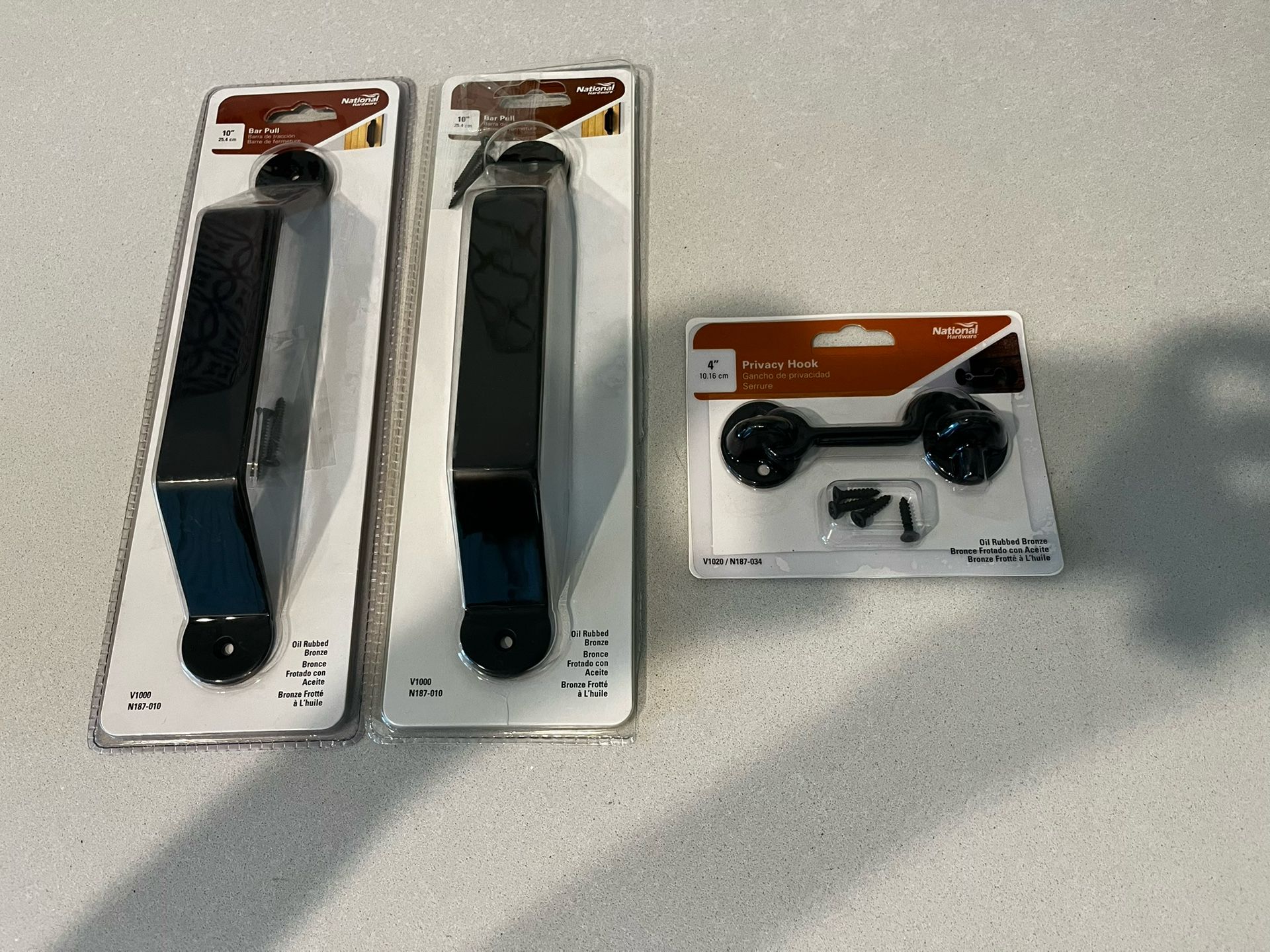 Two, never used metal barn door pulls and privacy hook. Pulls are 10” / Hook is 4”