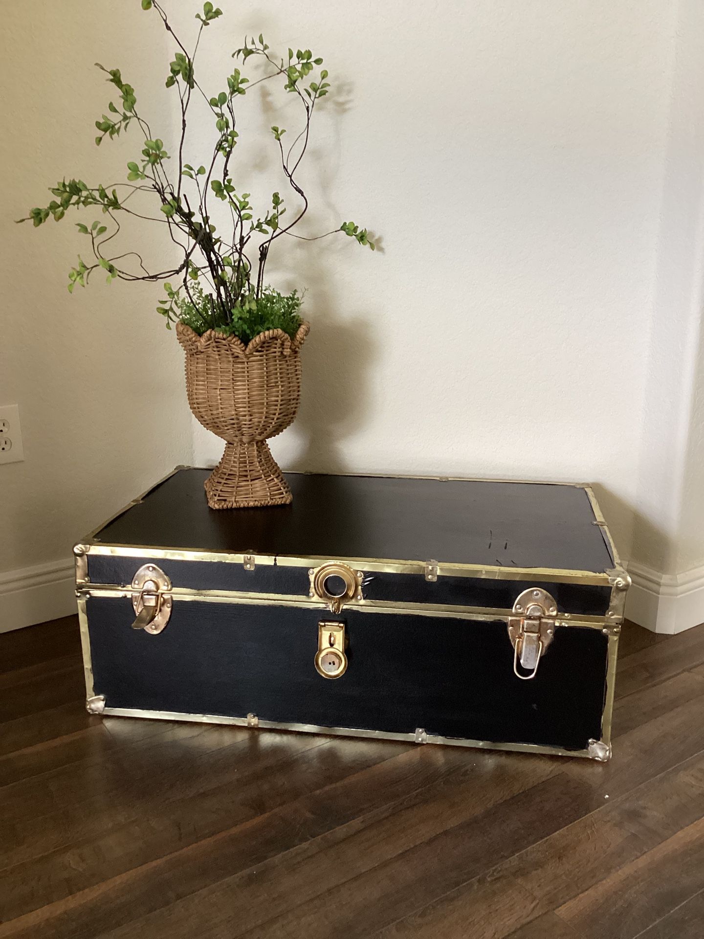 Vintage storage steamer trunk painted black with gold hardware. The hardware is aged and weathered. Has leather handles on the sides. Lock no longer works and there isn’t a key. It measures 36 inches long by 13.5 inches tall and 20 1/4 deep. Great to use to store blankets, pillows, toys,books etc. Can be converted into a coffee table. Just add your own style of support underneath. Great farmhouse, rustic, eclectic style to add to your home. Would also look great in a teenage boys room or office.