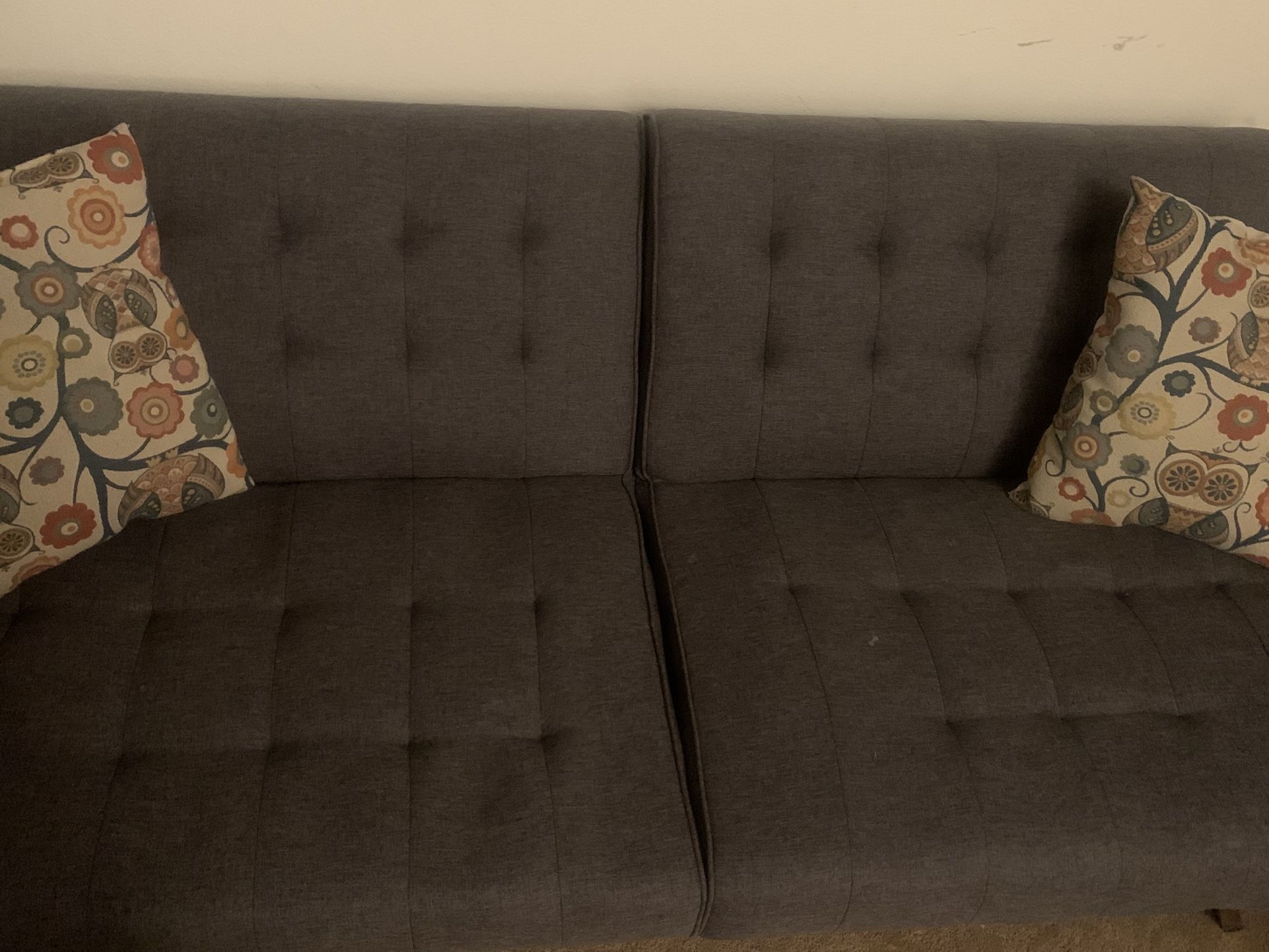 Small grey couch, folds out into a bed. Good condition. Very good for small spaces.